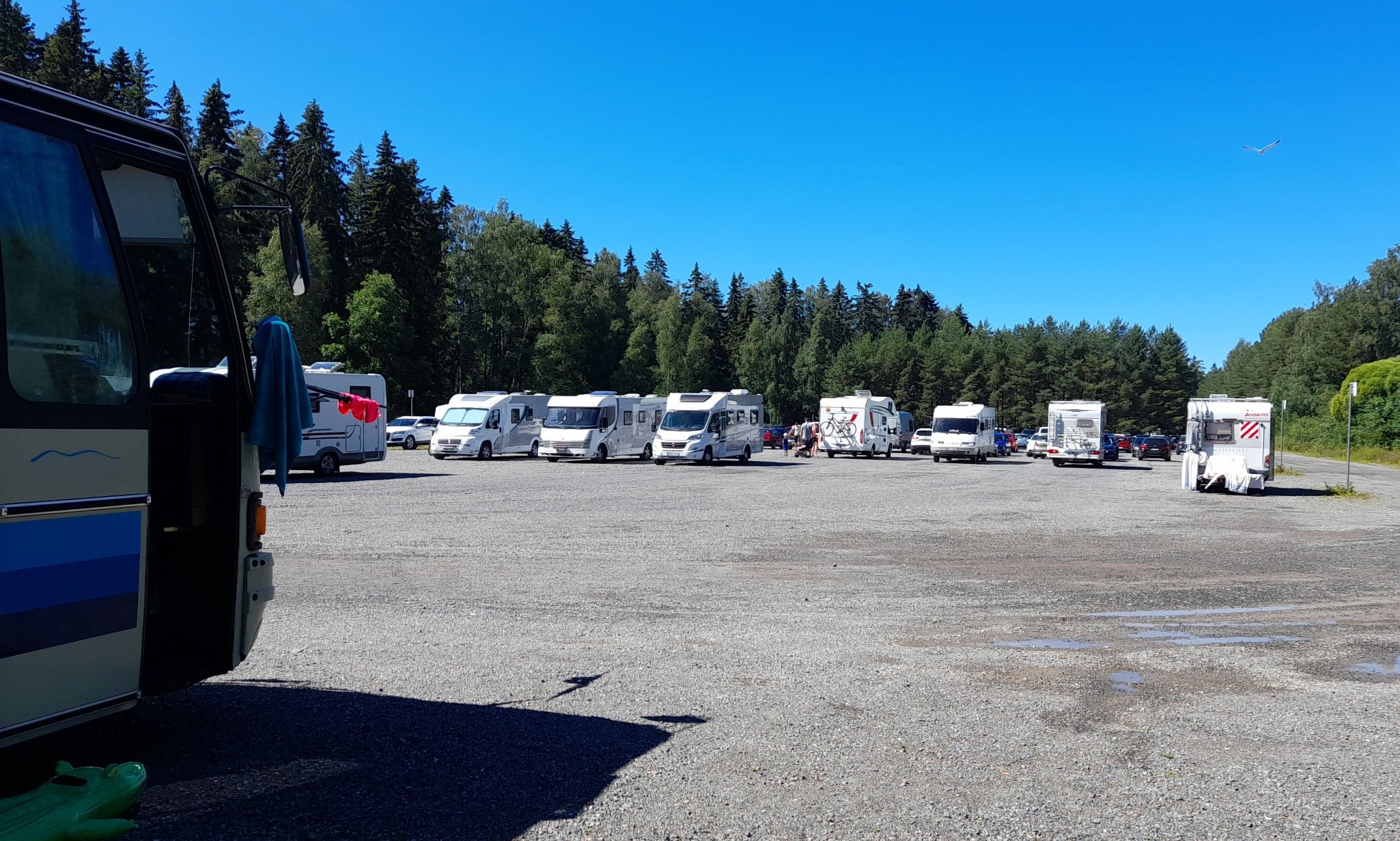Parkkipaikalla ei ollut illalla montaa autoa. Sai vapaasti etsiä sopivan kohdan. Aamusta parkkis täyttyi sitten nopeasti. Hyvä oli että valittiin reunapaikka. Keskeltä ei olisi päivällä päässyt pois. Uitiin ja löhöttiin mitä jaksettiin. Tullessa hoksattiin pikku grilli mikä myi jädeä ja ruokaa. Tilattiin annokset suolasta, ajatuksena ettei tarvi kokata autossa kun on lämmin jo valmiiksi. Palvelu oli hiukka hidasta ja annokset ei kyllä parhaasta päästä. Kaiken kruunasi lokit, joista yksi väänsi sonnat meidän kohdalla. Olin kyynärpäätä myöten tavarassa ja neidin ruoka-annos meni suoraan roskiin. Ei muuta kun pesulle ja hakemaan uutta annosta ja autoon syömään. Seuraavaksi suuntasimme Saloon katsomaan isän uutta asuntoa.