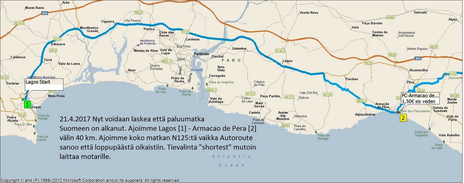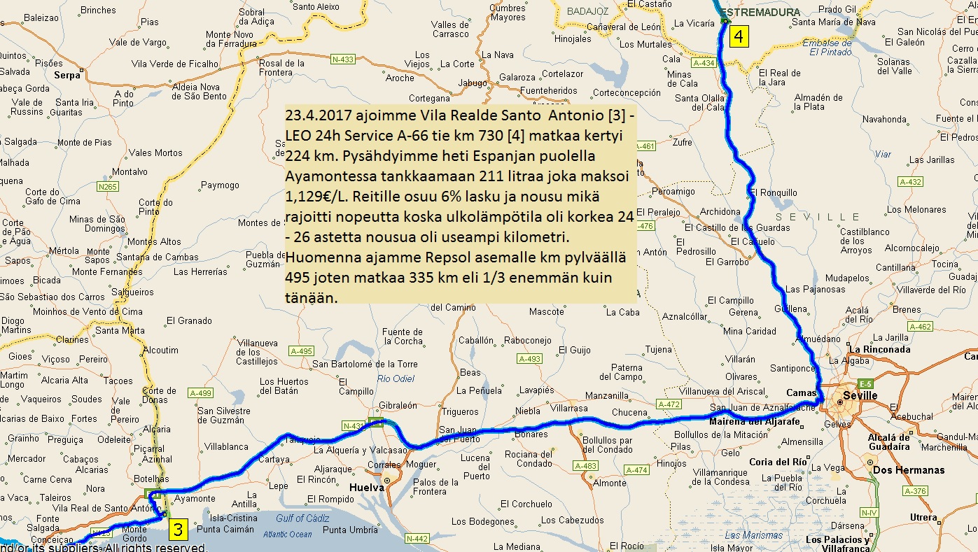 Eilen alkoi matka kotia kohti. Ajoimme Lagos - Armacao de Pera välin 40 km ja tänään on vuorossa ajo VRS Antonion. Samalla julkaisen paluu reittimme kartan reitti on 3313 km Lagos - Travemunde. Lähtöpäivä Lagos 21.4. ja tulo Travemunde satama 3.5. 2017 siinä on kolme luppo päivää joita ei viellä ole täytetty.