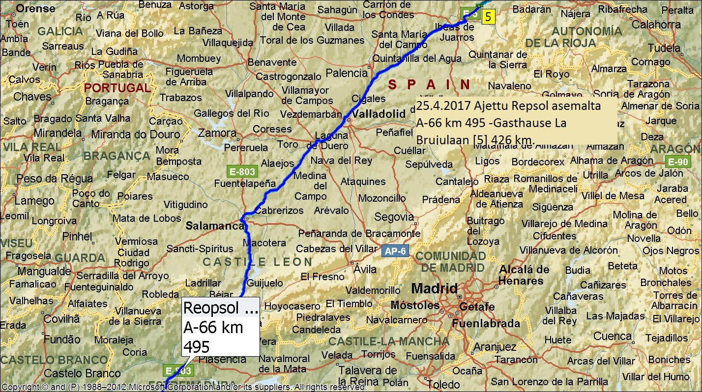 Olemme nyt Pohjois Espanjassa Kun auton sammutimme oli ulkolämpötila vain 16 astetta mutta tämä paikka on kilometrin korkeudessä mikä jo sinäänsä tarkoittaa 7,5 asteen lämpötilan pudotusta verrattuna merenpinnan tasoon.