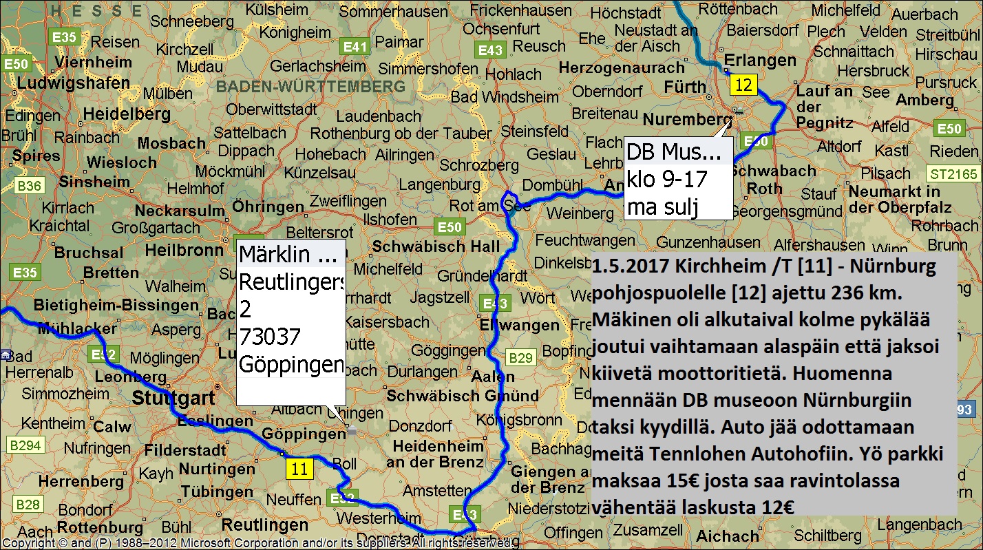 Siirryimme tänne että voimme käydä kaupungissa katsomassa DB museon eli Saksan rautateiden museon. Tämä siis huomenna . Museokäynnin jälkeen ajamme A7 tietä kohti pohjoista Hannoverin seudulle paikalliseen Autohofiin yöksi Sitten keskiviikkona lököilemme hiljakseen kohti Traven satamaa jossa on tarkoitus olla joskus illalla. Aina sinne on menty lian aikaisin vaikka laivaan pääsee yleensä klo 23 - 01 välisenä aikana.