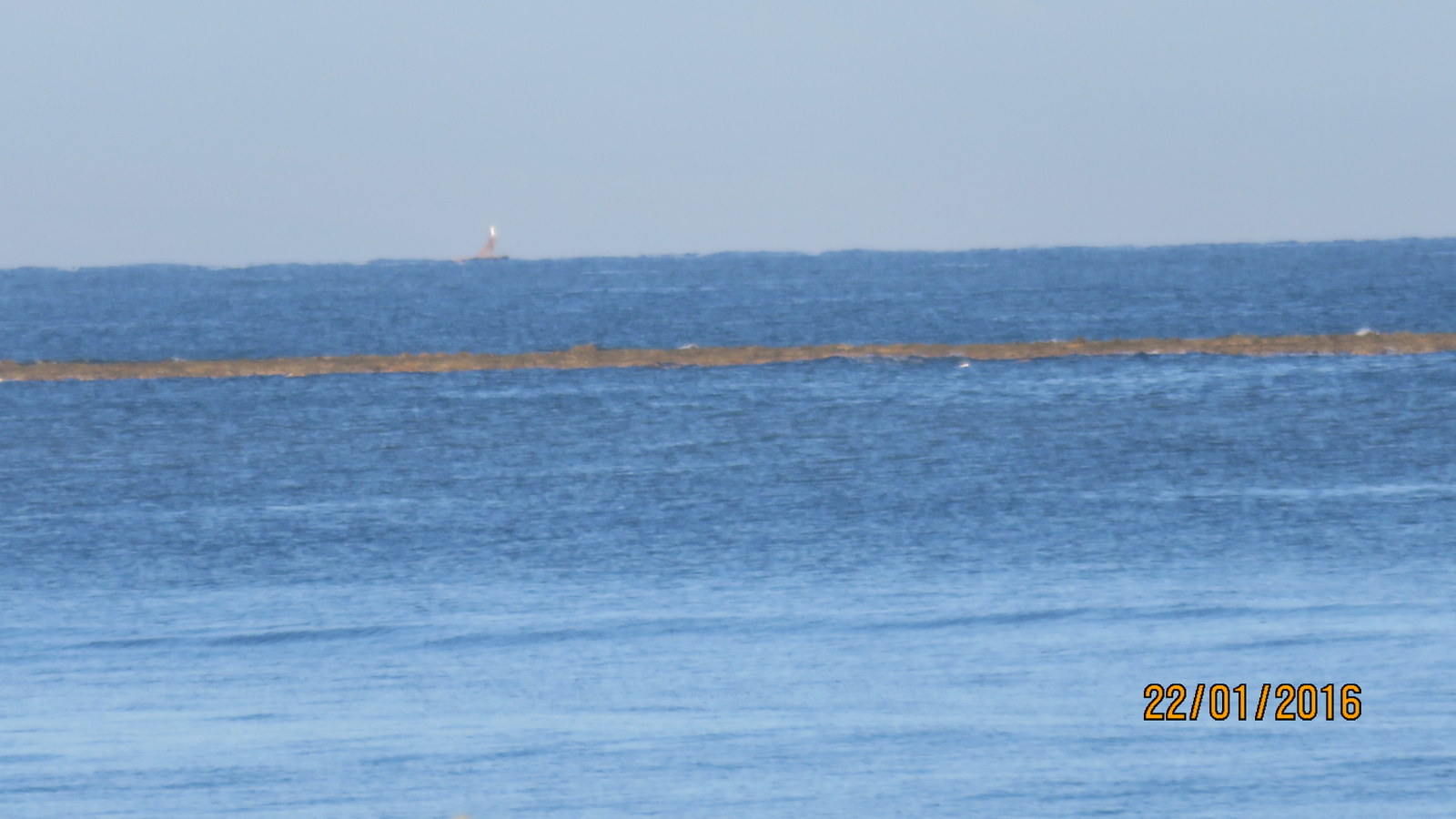 Tänä aamuna klo 7 oli laskuvesi niin alhaalla että koralliriutta oli näkyvissä pitkäln matkaa tämän rannikon edustalla. Kuva otettu isolla zoomilla 135mm tai 35mm kameran mitoilla 958mm.
