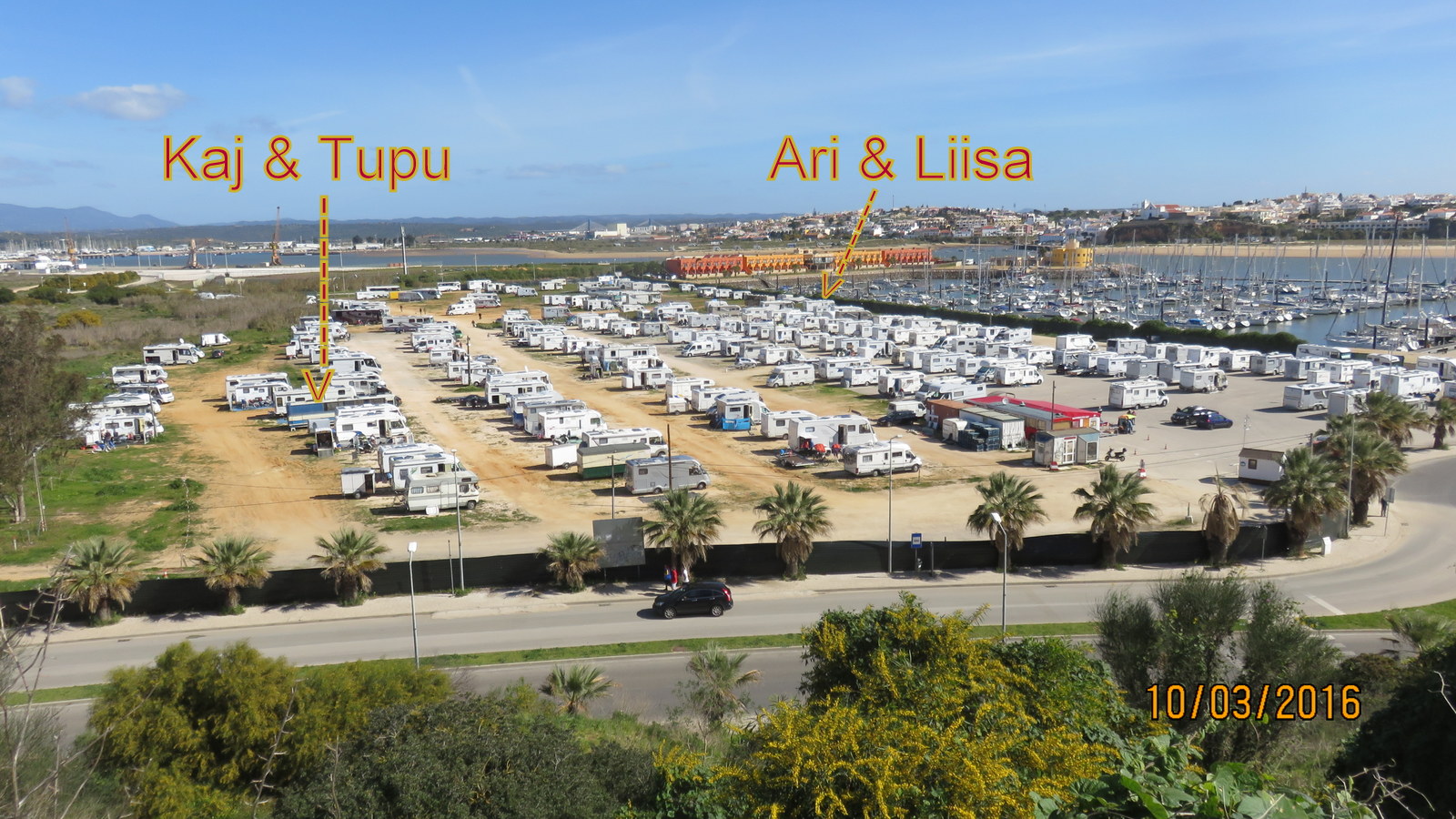 Tänne tulimme maanantaina Arade joen parkkipaikalle eli Praia da Rochan nyt 4€ parkkipaikka palvelut on kohdillaan tänne on saatu vessat ja suihkut ravintola ja torikauppias jolta voi ostaa vihanneksia, hedelmiä ja hunajaakin jos elo ei muutoin ole riittävän makiata. Tänään kävin ylhäällä hyllyllä kuvaamassa tämän parkkipaikan paljon on autoja ja turvavälit jopa suomen sääntöjen mukaiset n. 4m, vastaava Portugalin sääntö sanoo 2m.