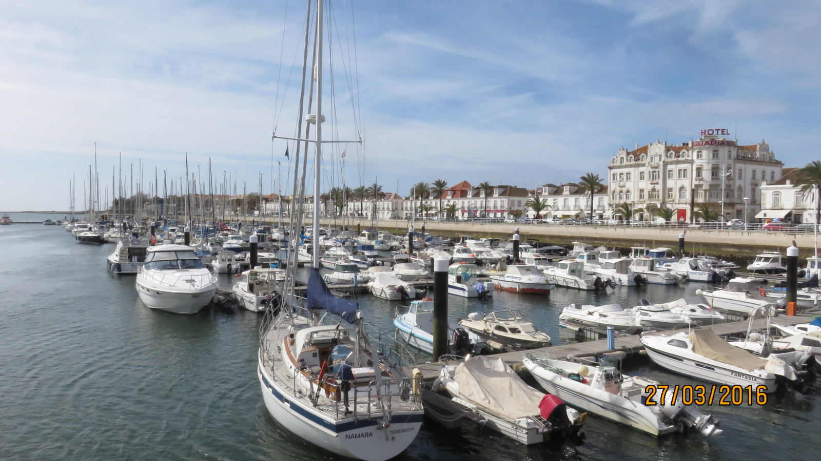 Olemme Espanjan rajajoen rannassa entisessä rahtisatamassa. Tämä on maksullinen 4,50€/vrk karavan parkki jossa saa vettä jättää kaikki jätteet ja halutessaan voi ostaa sähköä 2,50€/vrk. Teimme eilen kävelyretken torille Pitkänperjantain takia oli paljon väkeä liikkeellä ja ruokapaikatkin menivät nenän edestä kiinni saimme Portugalilaisen sokerimunkin ostettua torilta. Tänään on sitten nälkä eli lähdemme nyt syömään. Muut kuvat Picasaweb kansiossa.