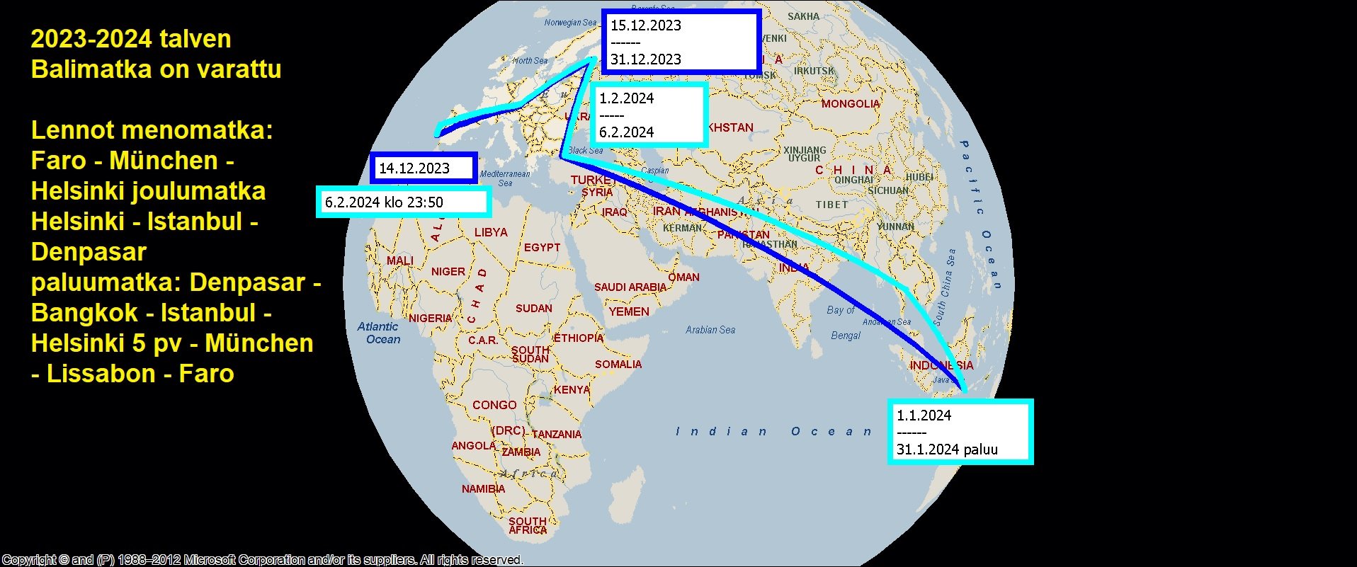 Nyt lähestyyy seuraava vaihe talven matkasta. Lento Suomeen 14.12. joulunviettoon 31.12 lento kohti Indonesiaa