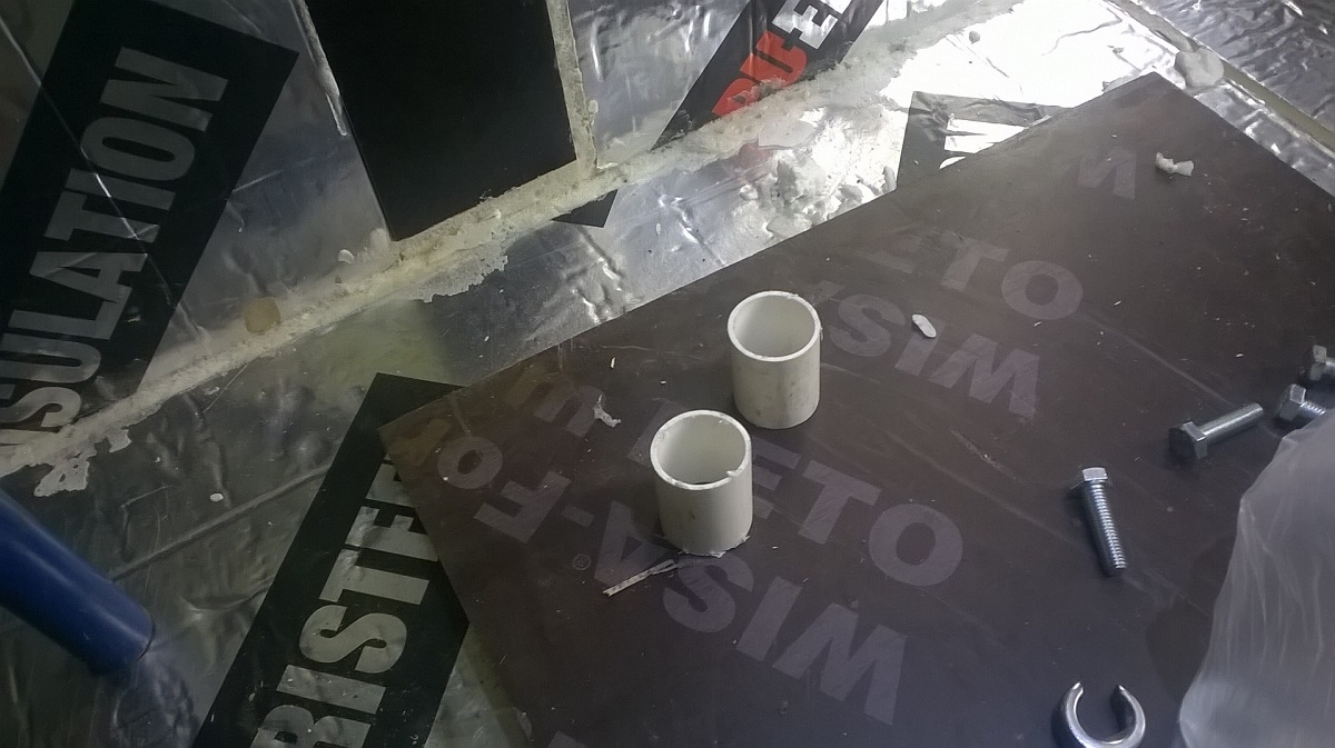 Nytte joku saattaa ihmetellä et "mikä ongelma on noissa ruuveissa"... Niissä ei sinänsä olekkaan se "onkelman ydin"... ne kestää kyllä... mutta ku mää "suuressa viisaudessani" ajattelin...(tiiättä mitä mää kädelläni teen... :D nostan sen taas virheen merkiks) no enivei... Mää siinä "älyn puuskassa" arvelin että pienennän viel tuota "kylmäsiltaa" ja ruuvasin noi soirot "villinä" pystytolppien väliin... eli noi vanerisoirot on kiinni niissä välivaakaraudoissa...ja pysty putken kohdalla on se 40mm spu-levyä... ja eriste on ohuimmillaan juurikin siinä vaakaputkulaisen kohdalla... (vähän niinku ristikoolaus) Yks huono kuva lisää... :)