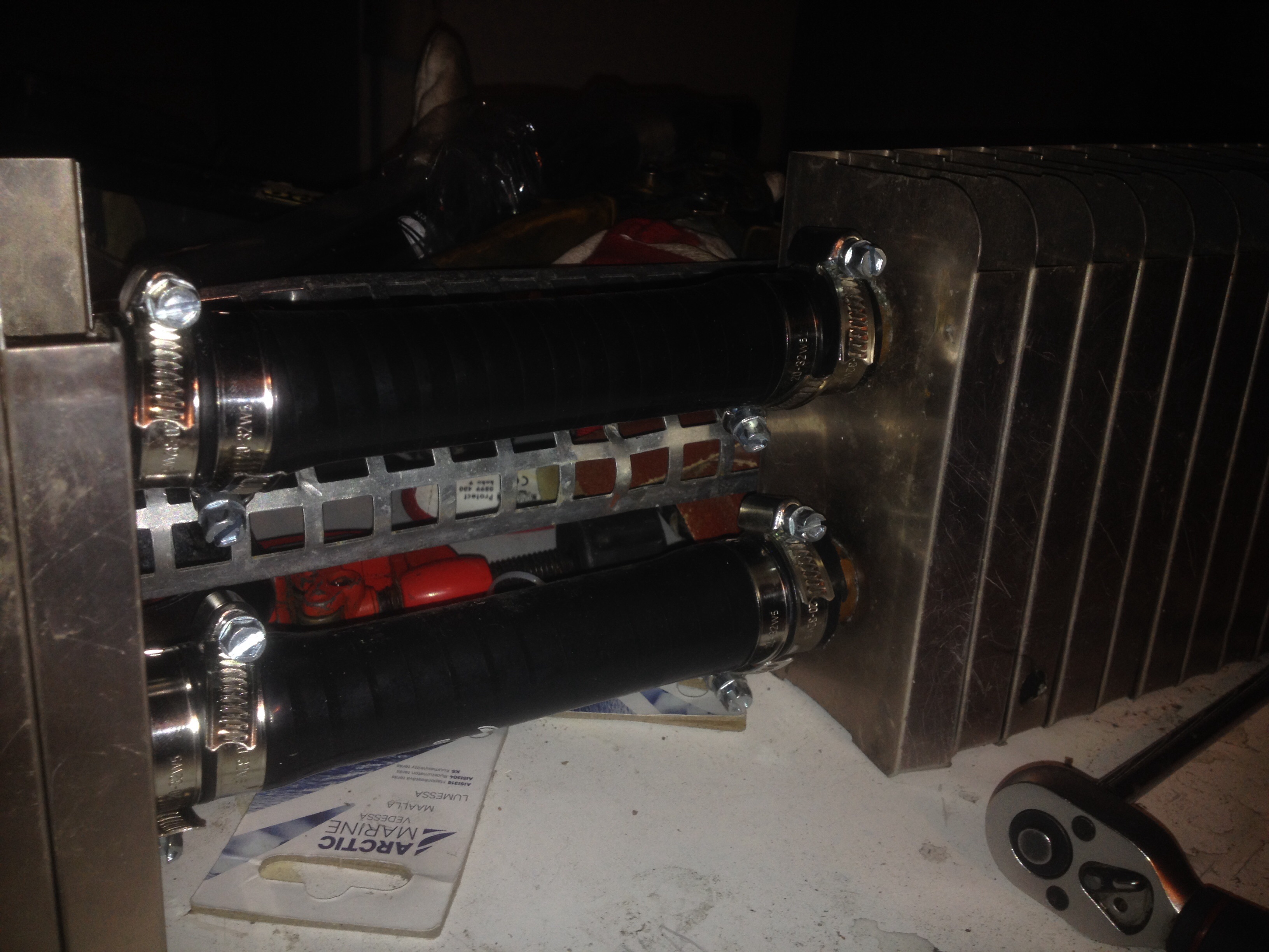 Ei ollu enää pitkää pätkää patteria hyllyssä, ni piti tehdä kahdesta lyhyemmästä. Eikä se oo ollenkaan huono asia, ku lattia tekee siinä yhessä kohtaa semmosen tyhmän mutkan, ni siihen just se taitos. Silikoiuniletkua väliin ja parilla rosterilemmarilla kii.