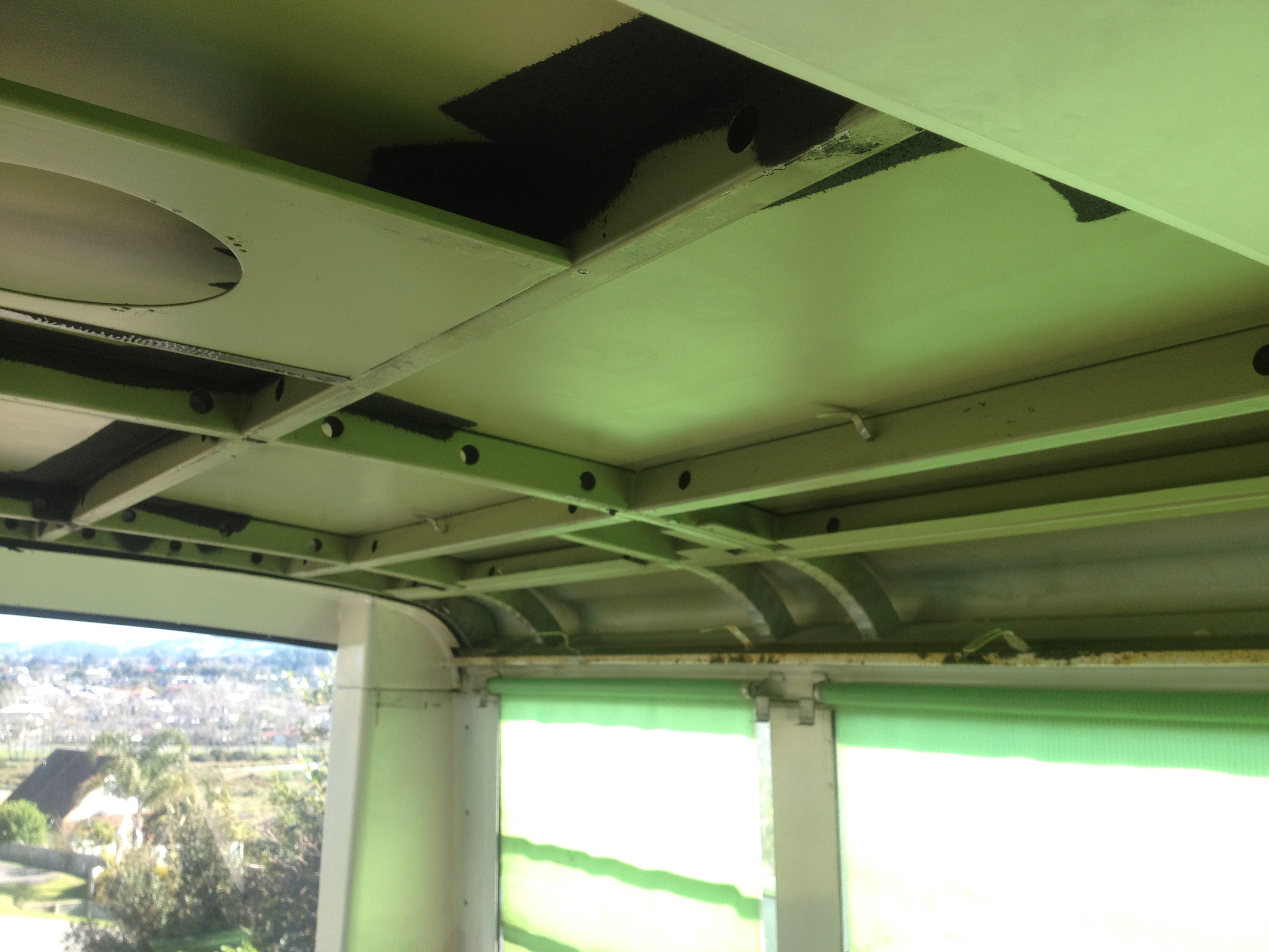 Jossain vaiheessa raahauduin kuolemantaudin kourista bussityömaalle, otin akkukoneen käteen ja aloin ruuvaa. Tossa on ihanasti kaikki asiat ruuveilla kii, niin et sen pystyy halutessaan akkukoneella purkaa koko pyydyksen. Perästä käsin kaks puol metriä pudotin kattovaneerit alas ja kaivelin lasivillat pois. Toisin ku Berkhof:issa, Hino:n eristystyöryhmä on tehny erinomaista jälkee. Joka kohdassa oli just oikeenkokonen palanen villaa alumiinipaperi yläpuolella kattoo vasten, eikä tyhjiä koloja ollu missään!