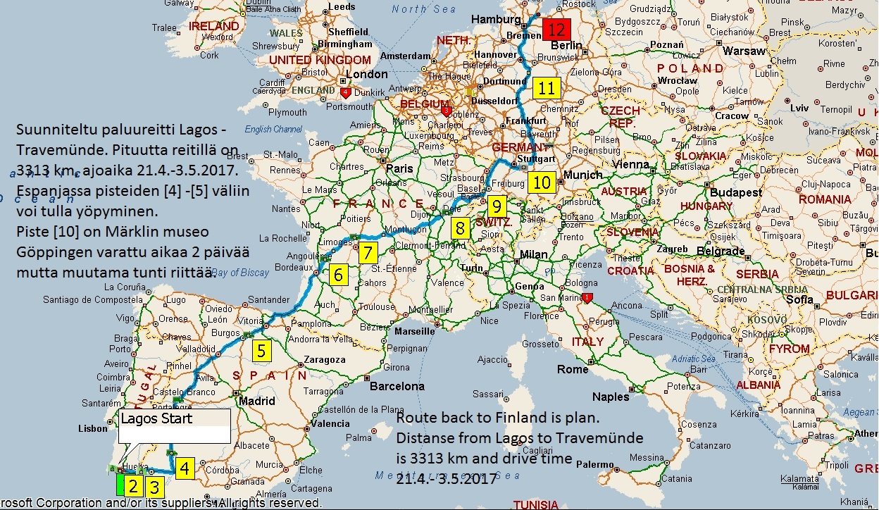 Eilen alkoi matka kotia kohti. Ajoimme Lagos - Armacao de Pera välin 40 km ja tänään on vuorossa ajo VRS Antonion. Samalla julkaisen paluu reittimme kartan reitti on 3313 km Lagos - Travemunde. Lähtöpäivä Lagos 21.4. ja tulo Travemunde satama 3.5. 2017 siinä on kolme luppo päivää joita ei viellä ole täytetty.