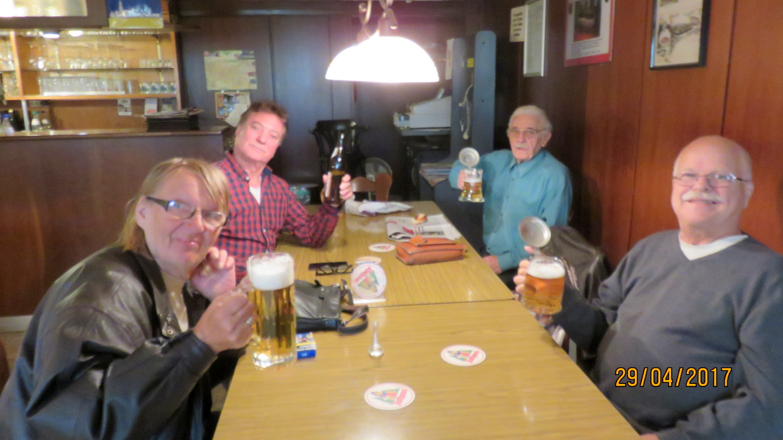 Olemme etelä Saksassa tänään sää lämpeni aamulla oli vielä +6 iltapäivällä +21 ja aurinko paistaa. Teimme retken eilen Göppingen nimiselle paikkakunnalle kävimme Märklin museossa onhan siellä vitriineissä aikamoiset kokelmat ja muutama junaratakin. Enemmän se kuitenkin on kauppa ja huoltoverstas. Kävelimme sieltä sitten rautatieasemalle matkka oli 2,5 km. Poikkesimmeensimmäiseen auki olleeseen kapakkaan 2 km kävelyn jälkeen. Meitä istui siellä neljä asiakasta kaikki samassa pöydässä baarin pitäjä rouva pöydän päässä (ei näy kuvassa koska on kameraan takana) Harmaa hapsinen herra lahjoitti oman tuoppinsa minulle varustettu etsatulla peuralla ja hänen nimikirjaimillaan. Täällä yksi kaksikerros bussi joka on vähän niikuin varustettu asumiselle oli sateliittiantenni auton edessä jaikkunoissa mustat lämpöverhot. Vaimo tykkää paikasta kun täällä on tupakka huonekkin jonne tarjoillaan.
