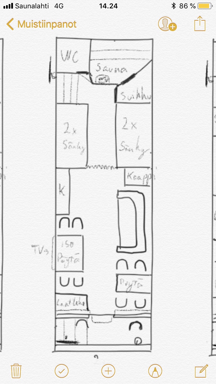 Vähän jouduttiin muokkaamaan alkuperäistä pohja piirustusta niin että jääkaapin viereen rakennetaan hyllyä ettei kopisis väliovi ja jääkaapin ovi yhteen. Eli joudutaan vähän pienentämään tulevaa levitettävää sohvaa että siitä taitaa jäädä käsituet pois :roll: