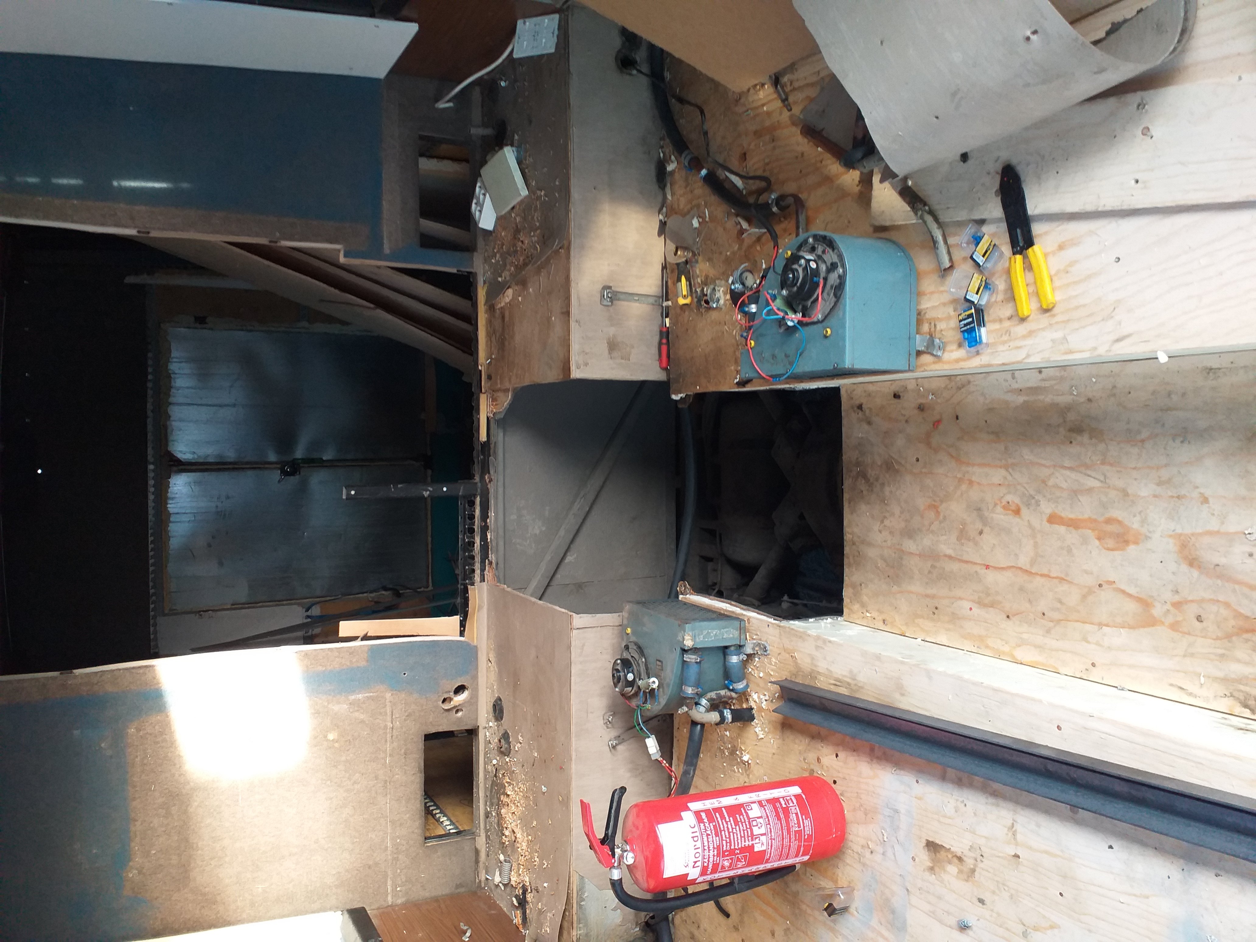 Sain irroitettua takatavaratilaa lämmittävät puhaltimet. Meinasin nakata roskiin. Sitten alkoi kaduttamaan, että ei perkule, ei niistä haittaakaan ole. Virittelin ne uuteen paikkaan. Tulevat kerrossänkyjen alapetien alle puhaltamaan käytävää kohti. Samalla sain ilmattua jäähdytysjärjestelmänkin kun noissa puhaltimissa on ilmausnipat. Sain myös sahattua tavaratilan ja matkustamon väliseen seinän alaosaan aukon matalampaa lattiaa varten.