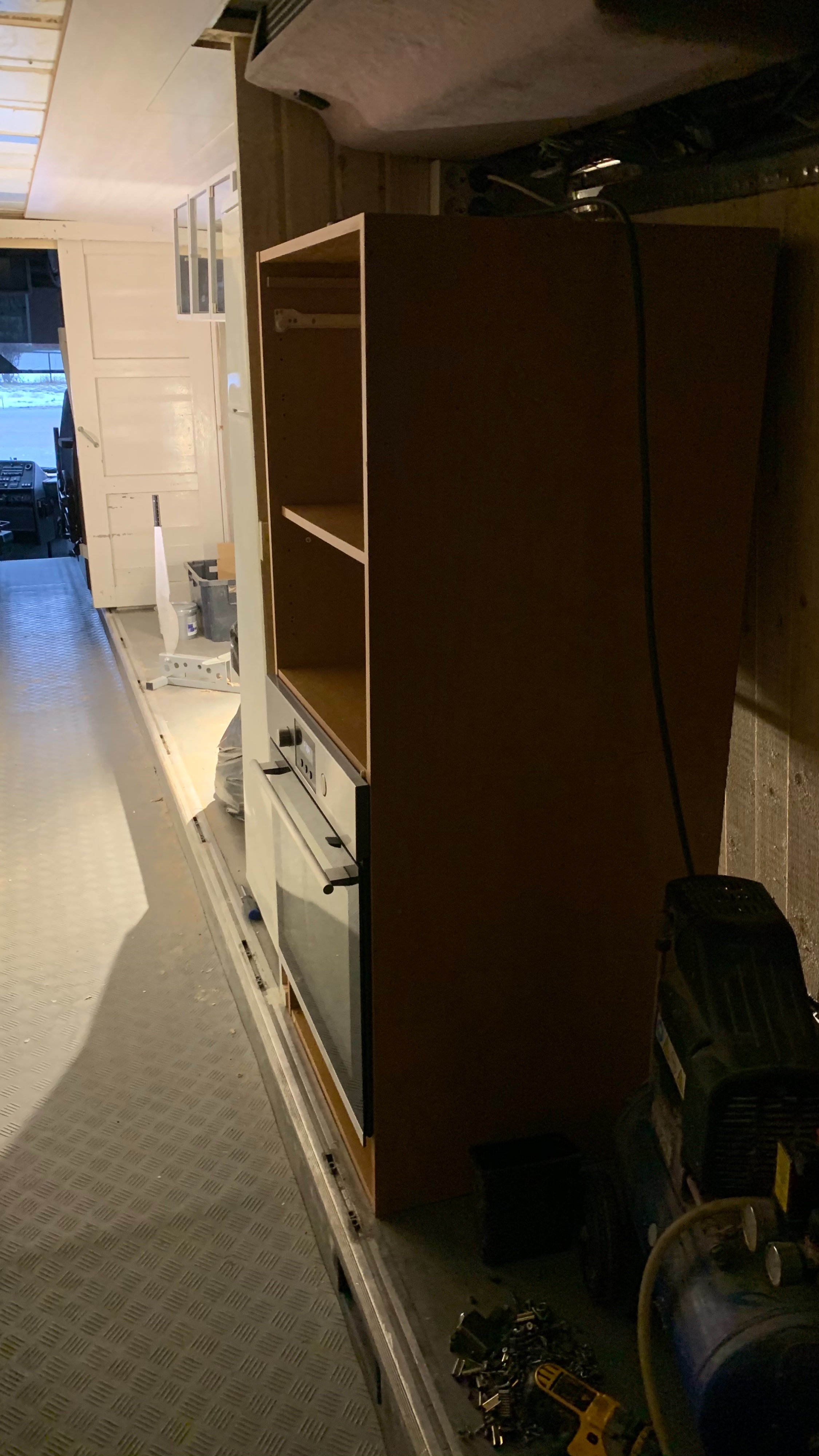 Tarkoitus tästä on tehdä talviasuttava asuntoauto jolla myös liikutaan, ohjaamo/matkustamo on siitä syystä erillään ja eristetty asuintilasta kokonaan väliseinällä että sais vähemmällä lämmittämiselle pysymään asuintilat lämpimänä talvella ja ehkäpä viileänä kesällä?