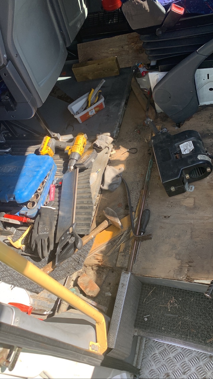 Vielä pitäis löytää apukädet auton alle et sais penkin pultit kii, irrotella toi keltanen kaide myös yläpäästä ja putkit- / letkuttaa kennopuhallin uusiks. Mattoa kans vähä lattialle ja joku systeemi penkin taakse kun sinne jäi nyt pahhuus asumaan ku se feikkilattia on pois. Semmonen kynnys.