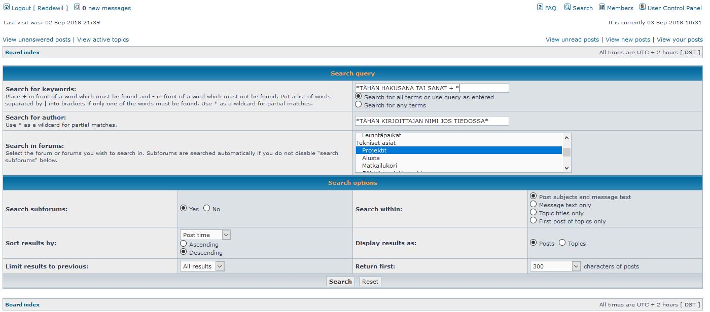 Kyllä voi, tuolta oikealta ylhäältä "Search" ja kuvan mukaan kirjotat mitä haet. + jos taytyy useampaa sanaa löytyä ja * jos et kirjoita koko sanaa. Esim. jos haet lämmityshommia niin lämmitys* ilp* *weba*. Tai muita sanan alkuja, tuo viimeinen tuo mm ilmawebastot esiin.