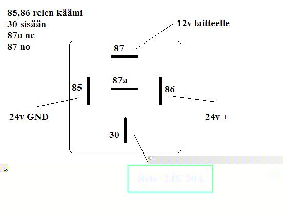 Mutta eihän tässä ole sellaista ongelmaa, kun käyttää 24V relettä, ja sen kautta ohjaa 12V. Eli rele on 24V20A ja sille annetaan 24V napoihin 85 ja 86. Napaan 30 syötetään 12V