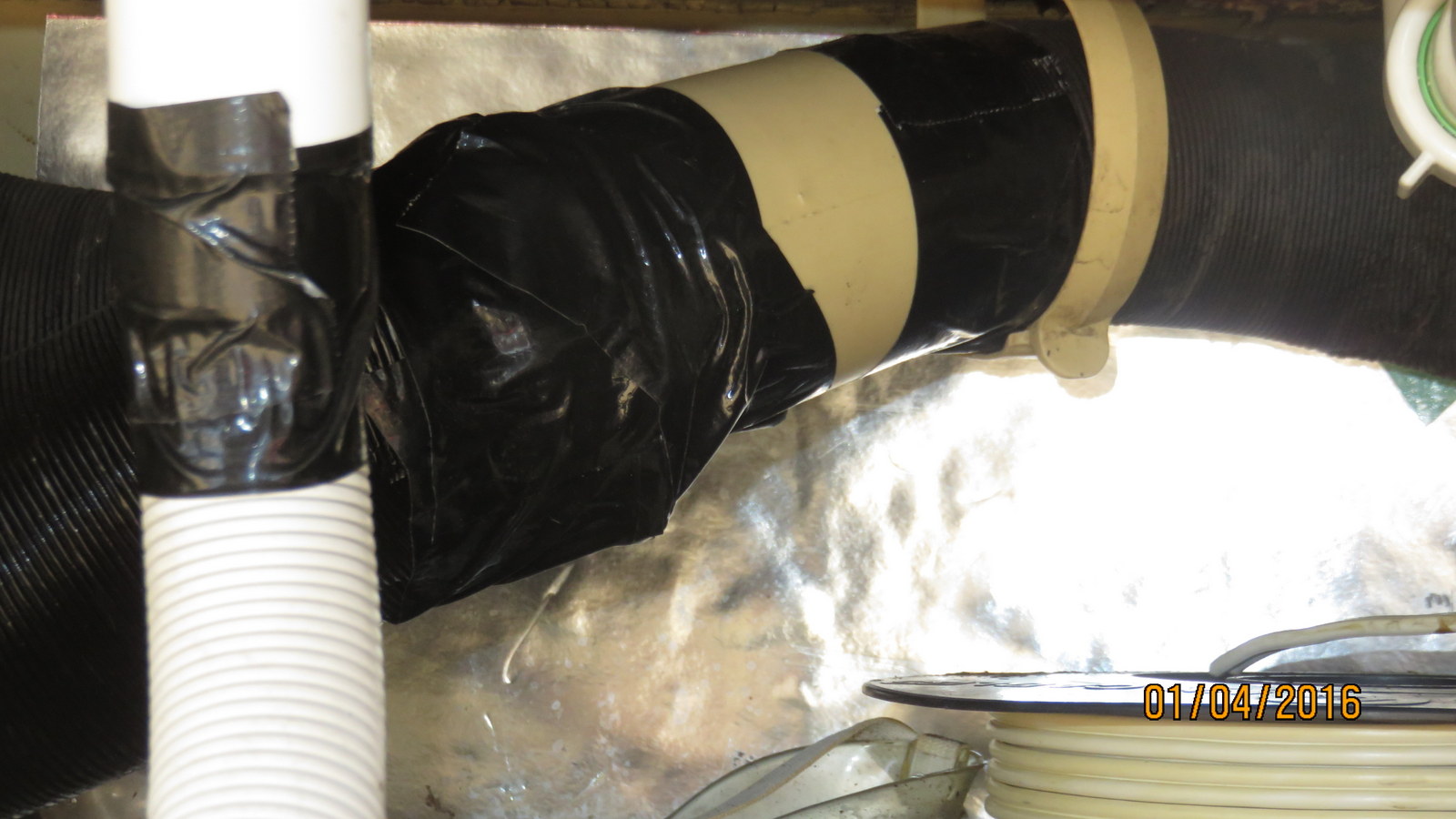 Samalla huomasin että suihkun viemäriputkeen oli lämminilma putken letkuklemmari kalvanut ison reijän onneksi sen pystyi lyhentämään. Tämän putken liitoksen kestoa paransin teipillä.