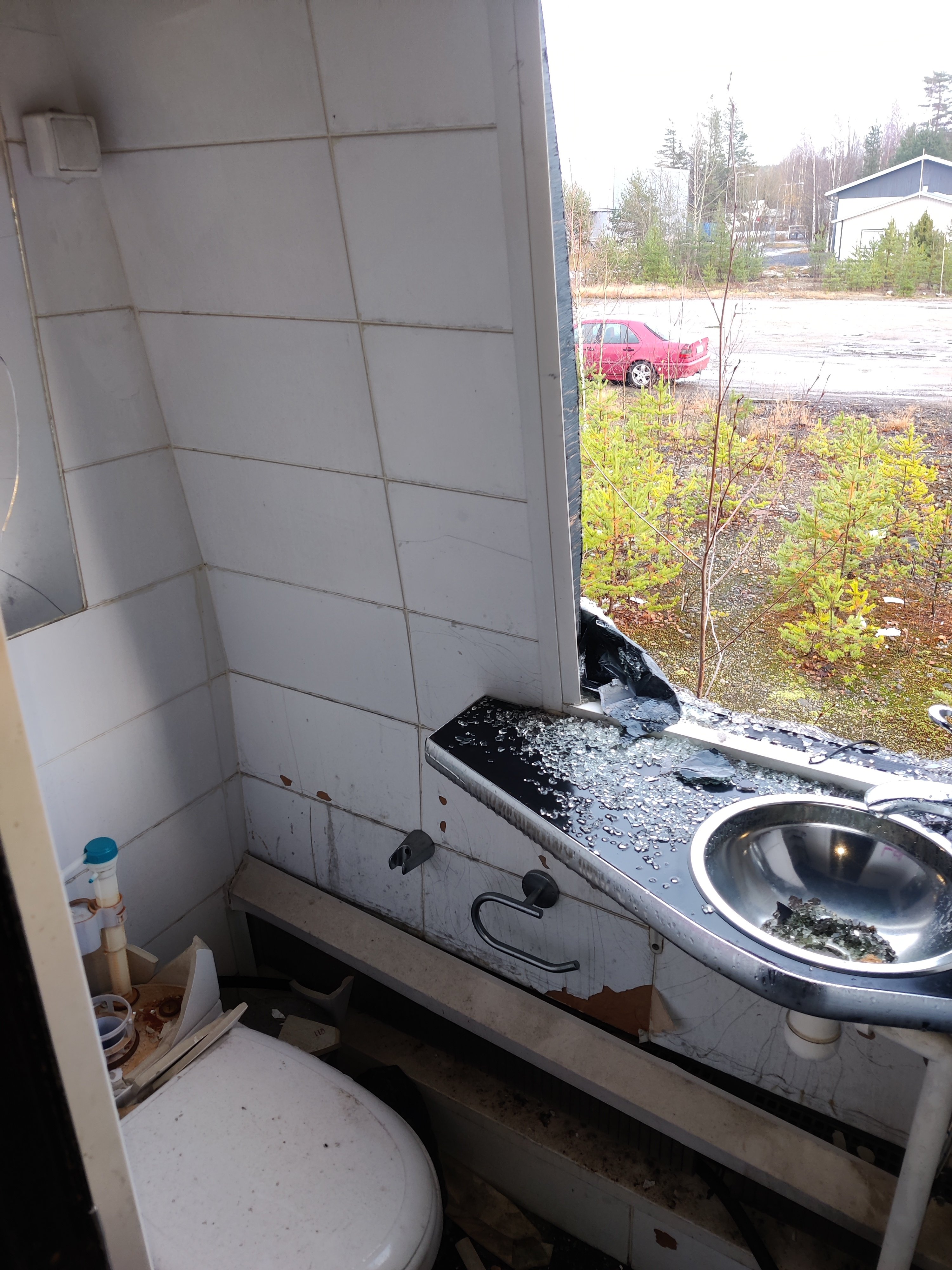 E: keulan edessä kyltti "EI KANNATA" joka säpäleinä sekä lintuverkko. Ilmeisesti ensimmäisenä tietty tuulilasi rikottu tästä.