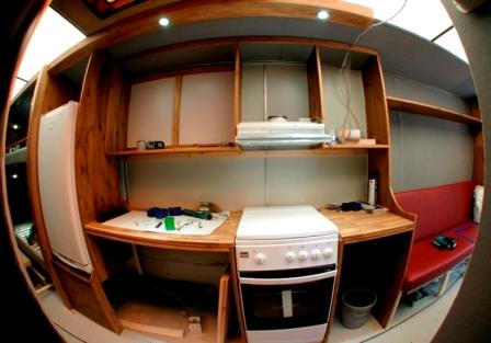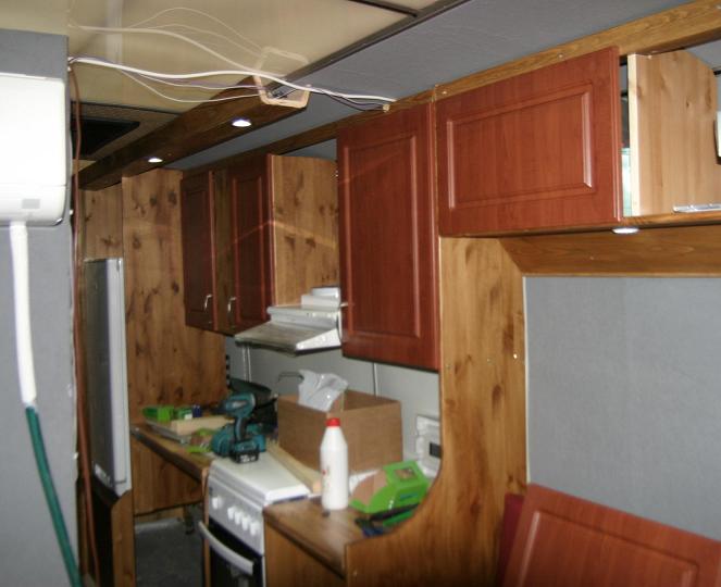 Seinät ja katot pinnoitettu nyt vuorossa puukässää...se on kivaa, kaikki palaset teen umpimännystä :lol: Keittiön runkopalat paikoillaan ja mallasin jääkaappia ja hellaa liesituulettimen kera jotta saa paremman kuvan mitä on tulossa. Kattoon tein aika massiiviset kotelot joissa kuletella johtoja ja samaan koteloon upotan ledivaloja sinne missä valoa kaivataan...ja onhan ne olevinaan jonkin sortin sisustus desaingia :lol: Sänkyjen osalta sama linja jatkui massiivipuiset osat jotka käsittelin tummalla tammivahalla, kaikki osat vie paljon tilaa mutta se tuntuu paremmalta kuin aivan rimpulat ratkaisut. Sänkyjen reunoissa pikanttina lisänä pakkasen kestävää nahkaa ja marjapuuron väriseksi polttomaalattua 8 mm seinämällä olevaa aluputkea :wink: Siitä se etenee :D