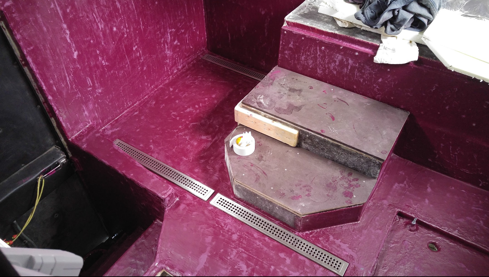 Osassa kuljetustilan seiniä, siellä missä vedellä läträtään, on 12mm filmi, kerros katkokuitua ja punosmatto, sitten topparia. Lattiassa ja rappusissa filmin päällä pari kerrosta katkokuitua ja sitten punosmatto ja toppari. Lattiassa filmin alla 20mm foami, jossa lattialämmitysputket ja niiden alla filmi ja sen alla teräspalkin ja välissä 40mm foami. Lämmitinhuoneesa ei ole lattialämmitystä.