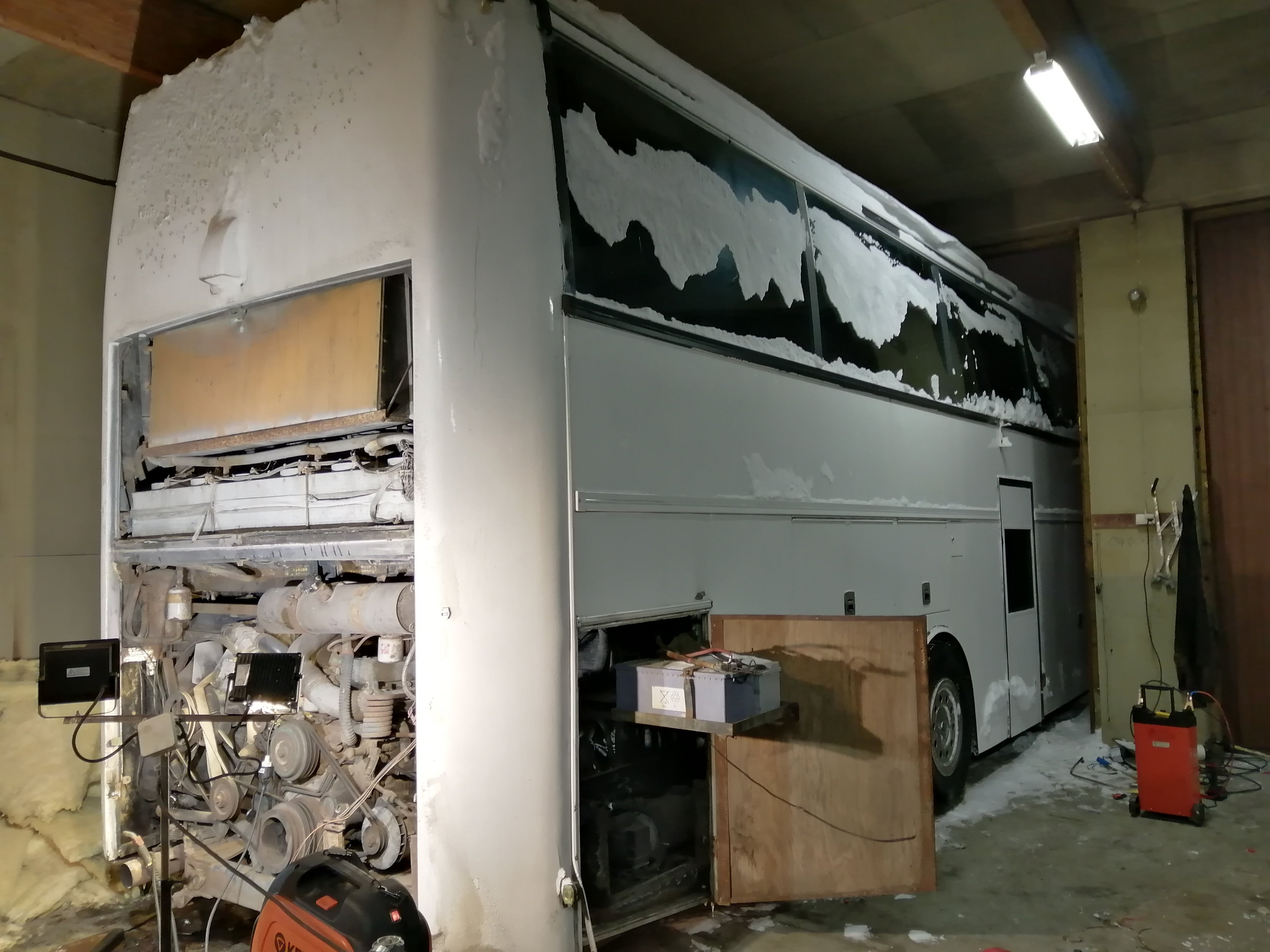 Takapää saatiin sopivasti halliin, joten pääsee rasvamontusta työstämään. EI montaa senttiä jää oviaukon, ja bussin väliin.