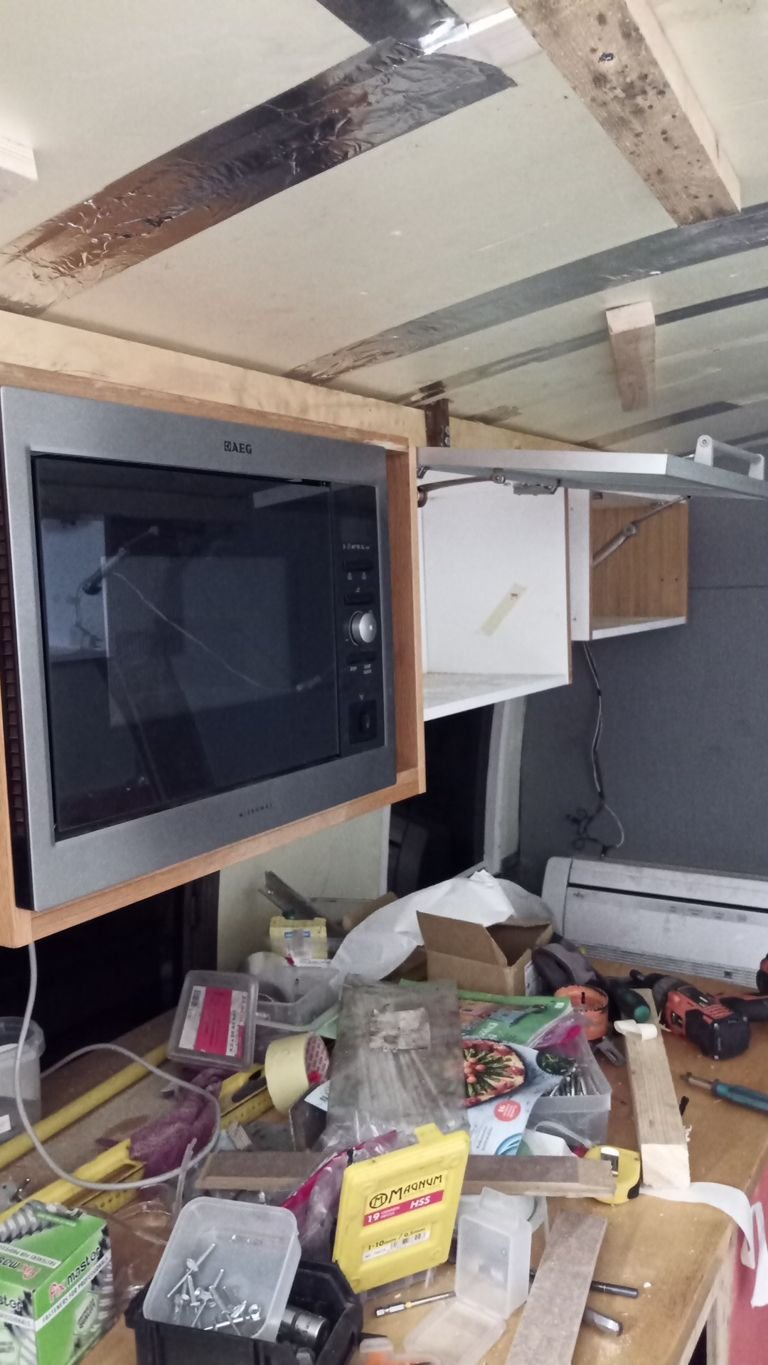 Jos on jo matkailuauto, katsastuksessa kelpaa myös keskeneräinen remontti. Kunhan näyttää siltä että on tulossa sängyt. Oli mulla siis 4 patjaa siellä, mutta ovat väärillä paikoilla. Ja lattia on kipsilevyä tai Finnfoamia, eli siis on mutta ei "oikea". Etuosassa on peri metriä mallina laminaattia...