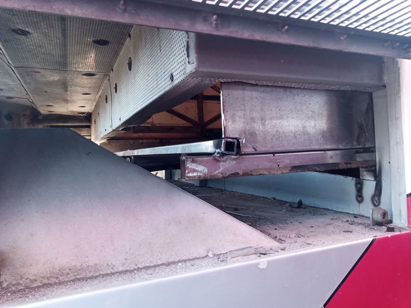 Tuolla takaosan pellin alareunassa, n. 20 cm uuden lattiatason yläpuolella näkyy paikat, mihin meni auton pituussuunnassa 30*30 mm ohutseinäputket. Nämä oli hitsattu vain alareunasta kiinni tuohon peltiin, bonuksena noiden kantattujen peltien väliset hitsit oli ratkennut irti tuon rungon kohdalta. Loppuosan rungosta muodostivat erilaiset nitomalla toisiinsa kiinnitetyt vanerisoirot, oli kai joissain väleissä liimakin, ainakin uutena ollut... Uudesta rungosta taisi tulla liian hyvä, notkuu jalan alla vähemmän kuin alkuperäinen, vaikka tästä puuttuu vaneritkin viel.