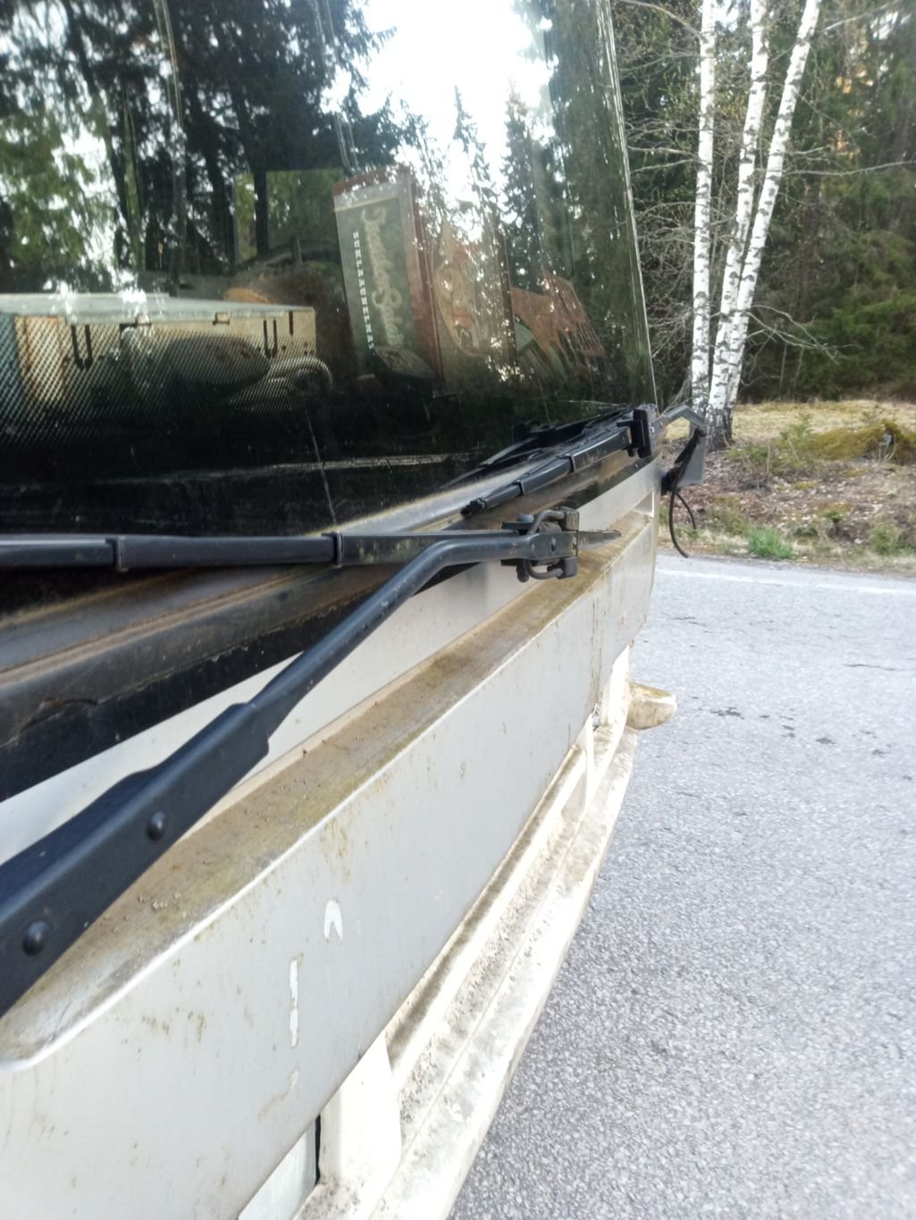 Just joku kuukausi sitten ihailtiin kaverin kanssa noita pyyhkijöitä, kun on harvinaisen jämptit, ei heilu ja osuu lasiinkin. Ekassa kuvassakin näkyy ero tähän.. No nyt osuu nokkamuoviin ja välystä 15 cm varren päässä :evil: onneks on täyskasko, kai se jotain ainaki korvaa...