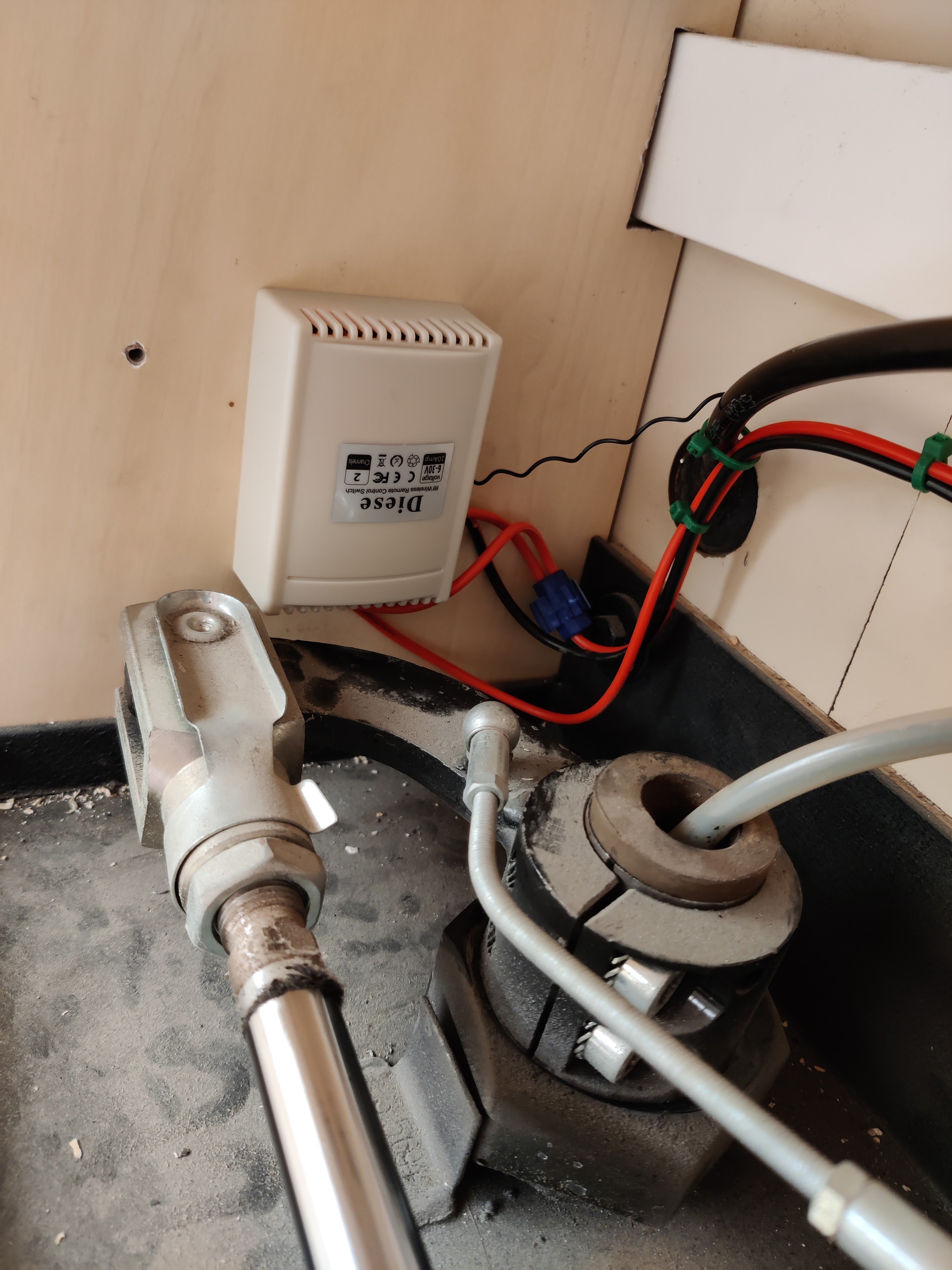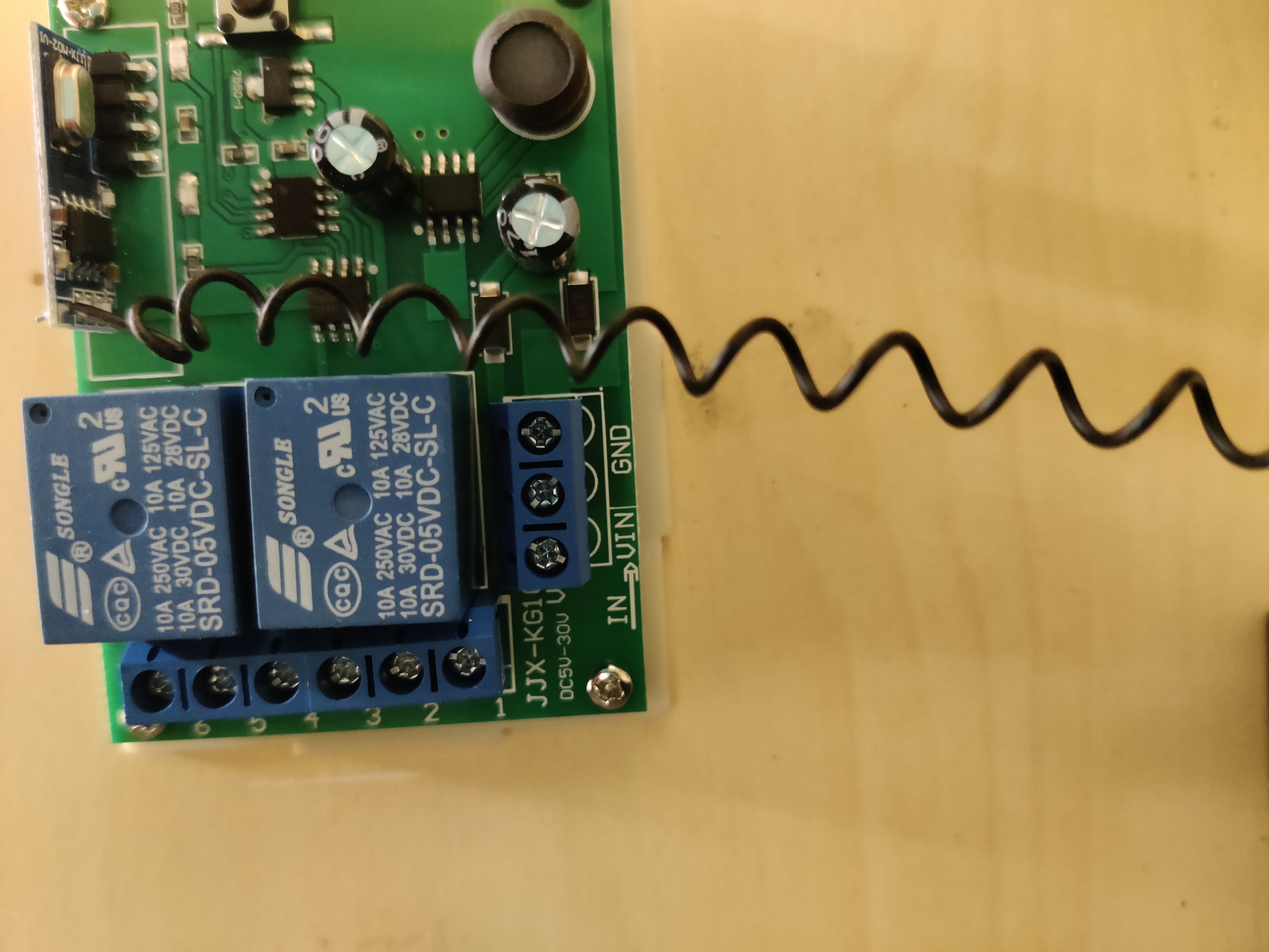 Koereissulla nyppi, kun joka pysähdyksellä piti ruveta säätämään oven riippulukon kanssa. Kirjurissa on valmiina katkaisija, jolla saa ulkona oven vieressä olevan avausnapin mykäksi. Joten ei tarvita kuin joku muu kikka, jolla saa oven auki. Ensin mietin jotain rfid-likijaa, joka tunnistaa puhelimen tai muun rfid-tunnisteen, mutta sitten löysin Saksan Amazonista parinkymmenen euron relesysteemin, joissa on mukana kaksi kaukosäädintä, ja joka toimii 6-30 voltin jännitteellä , eli menee bussiin heittämällä.