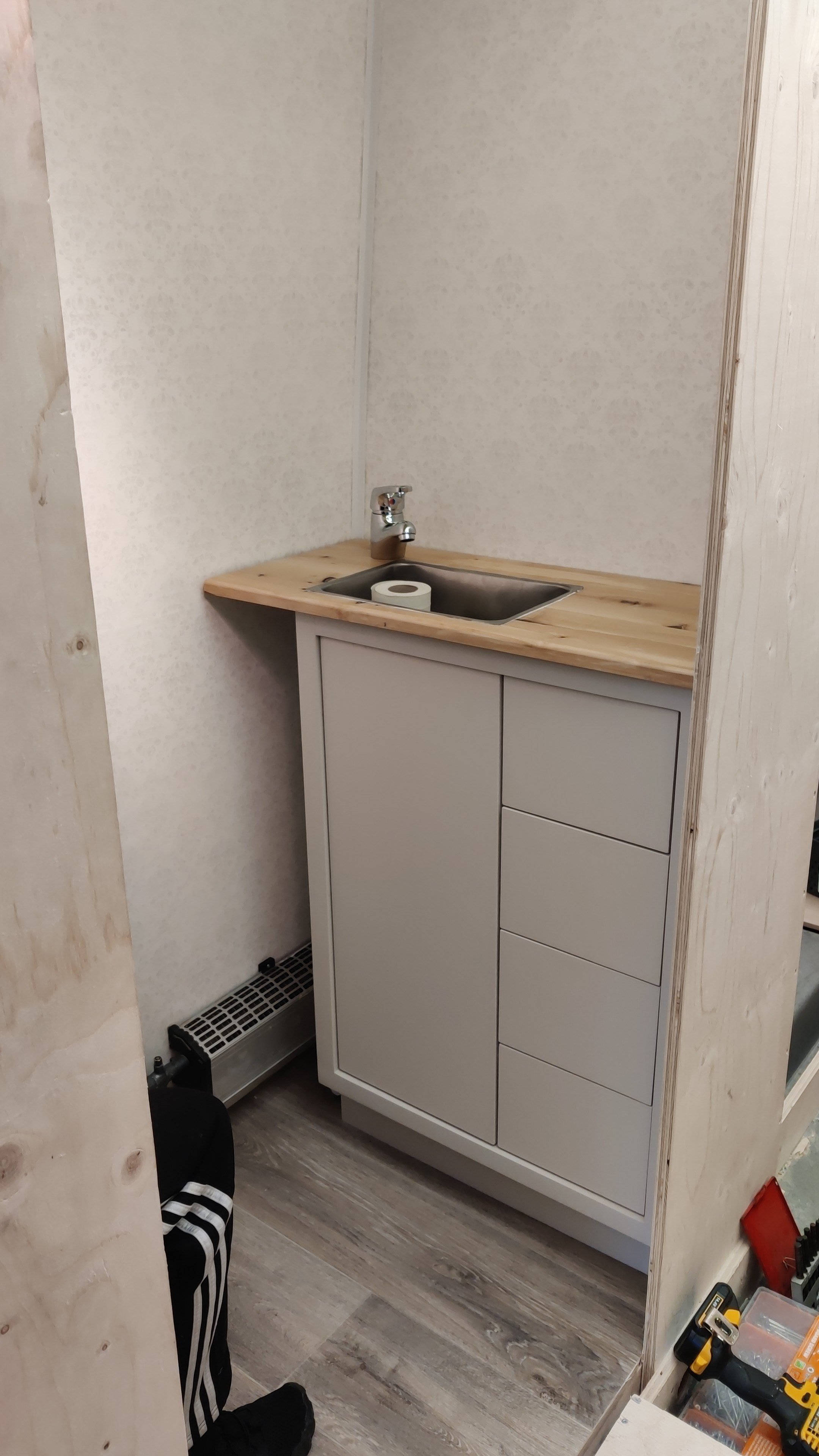 ja tästä pitäisi virittää harmaavesipönttö. Sattui löytymään justiinsa entisen vessan monttuun sopivan kokoinen n. 250 litrainen. Ja kun jäi vielä tilaa jättää alkuperäinen lämpöpatteri paikalleen, ei tarvitse pelätä että tiskivedet jäätyy pakkasilla.