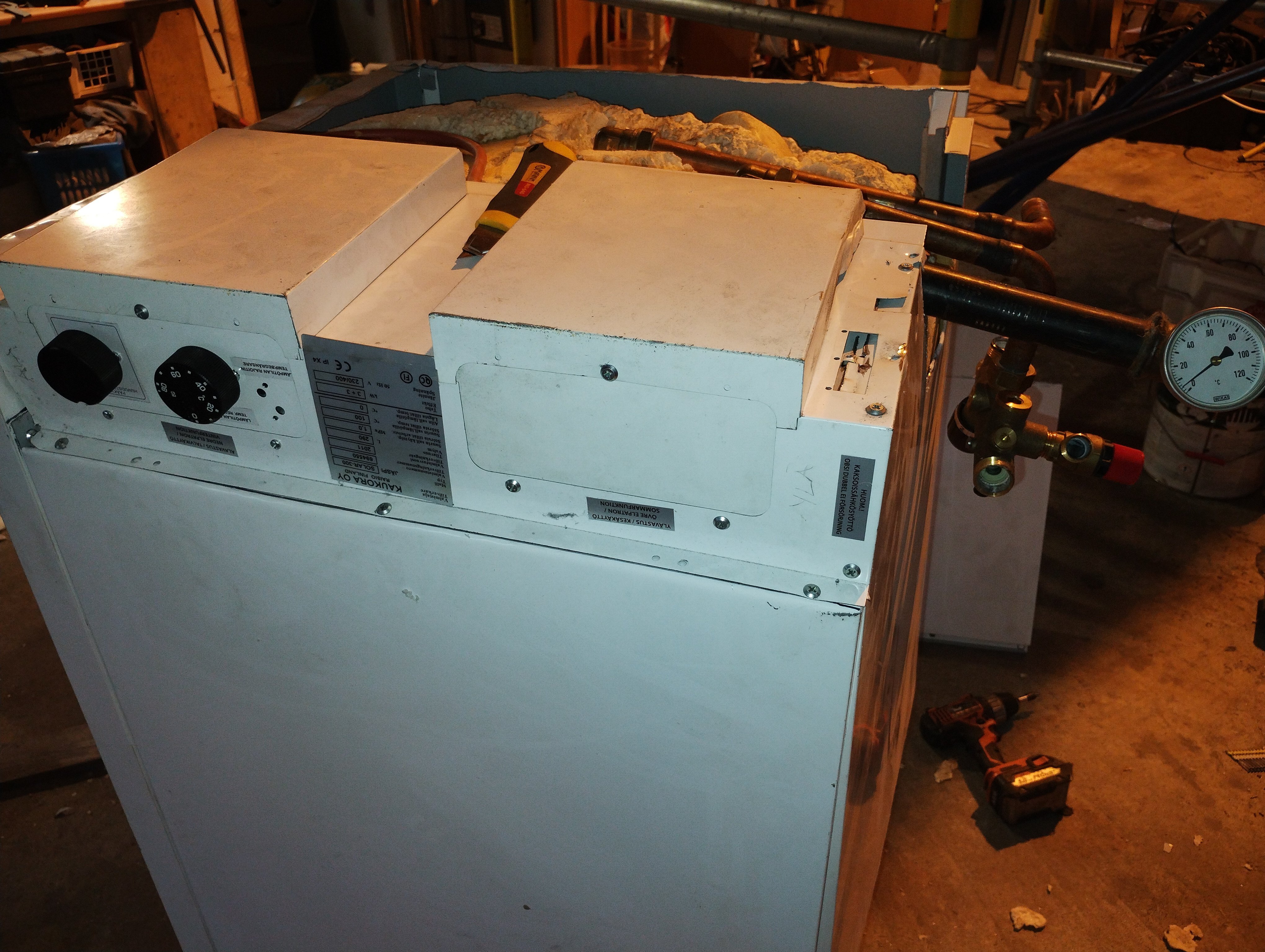 Kansi laitetaan päälle kun viimeiseenkin putkilähtöön löytyy jostain 22 mm helmi. Pohjaan tarttee vielä lämmityskierron paluu putki ja moottorikierukan lähdöt liittää niin pääsee sovittamaan ruumaan tätä taideteosta :D jospa tänä kesänä tulisi lämmintä vettä hanasta.