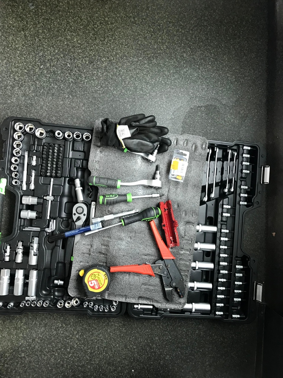 No kysyin myös varovasti et josko löytyis siedettävän hyvää työkalusarjaa. Mulla ku ei oo tossa autossa ku se tunkki. No se jäbä käveli työkaluhyllylle ja nappas siitä sen kaikkein suurimman setin. Olin vähä et jos akut maksaa nykyään kohta kolmesataa, ni tommonen työkalusetti on sit tonnin.