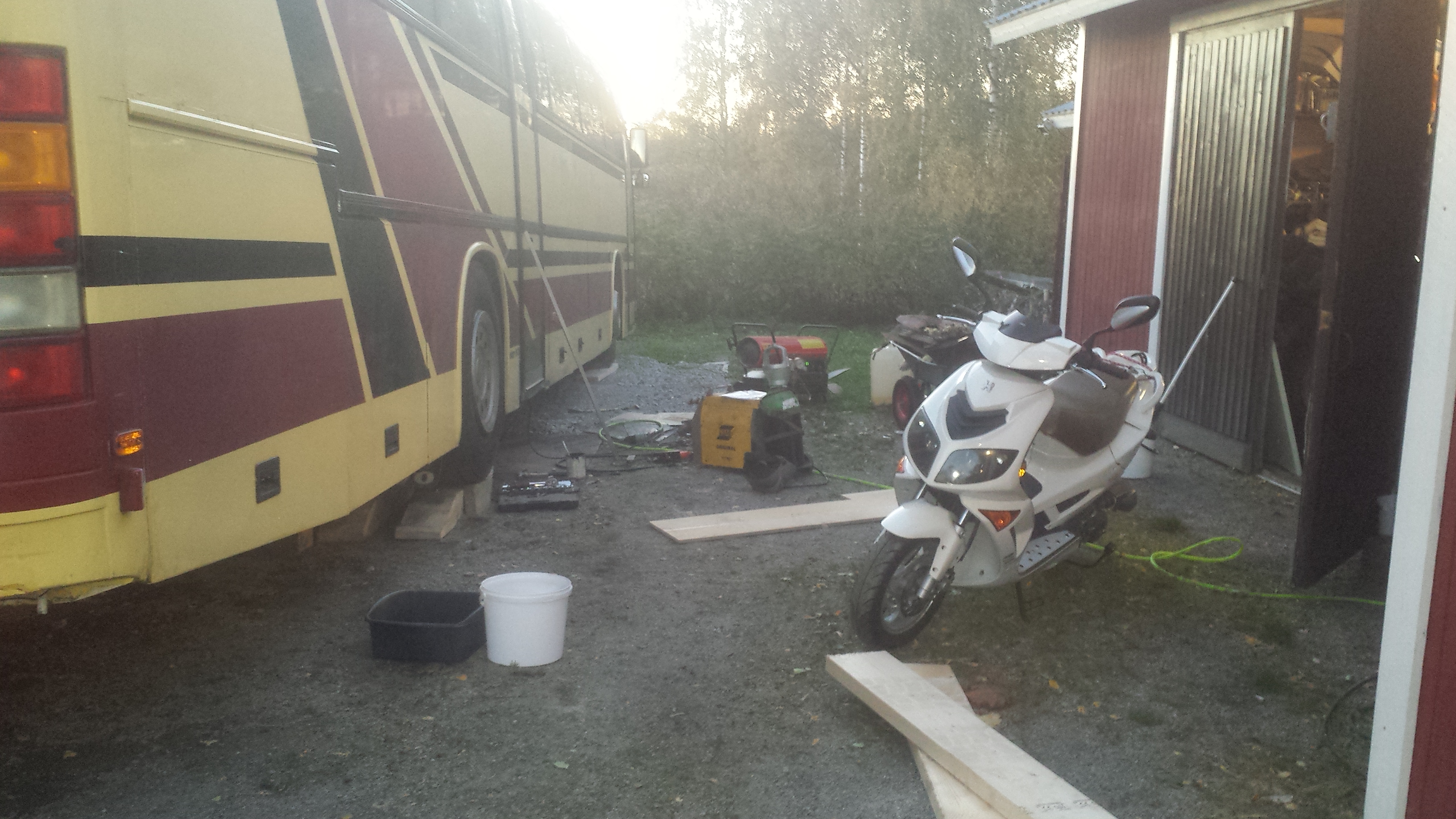 Akkukotelo hiottu ja verrexiä päälle. Kaverin kanssa vaihdettu uudet 80/140 perään ja pyöritty autossa miettie laminaatin asennusta...