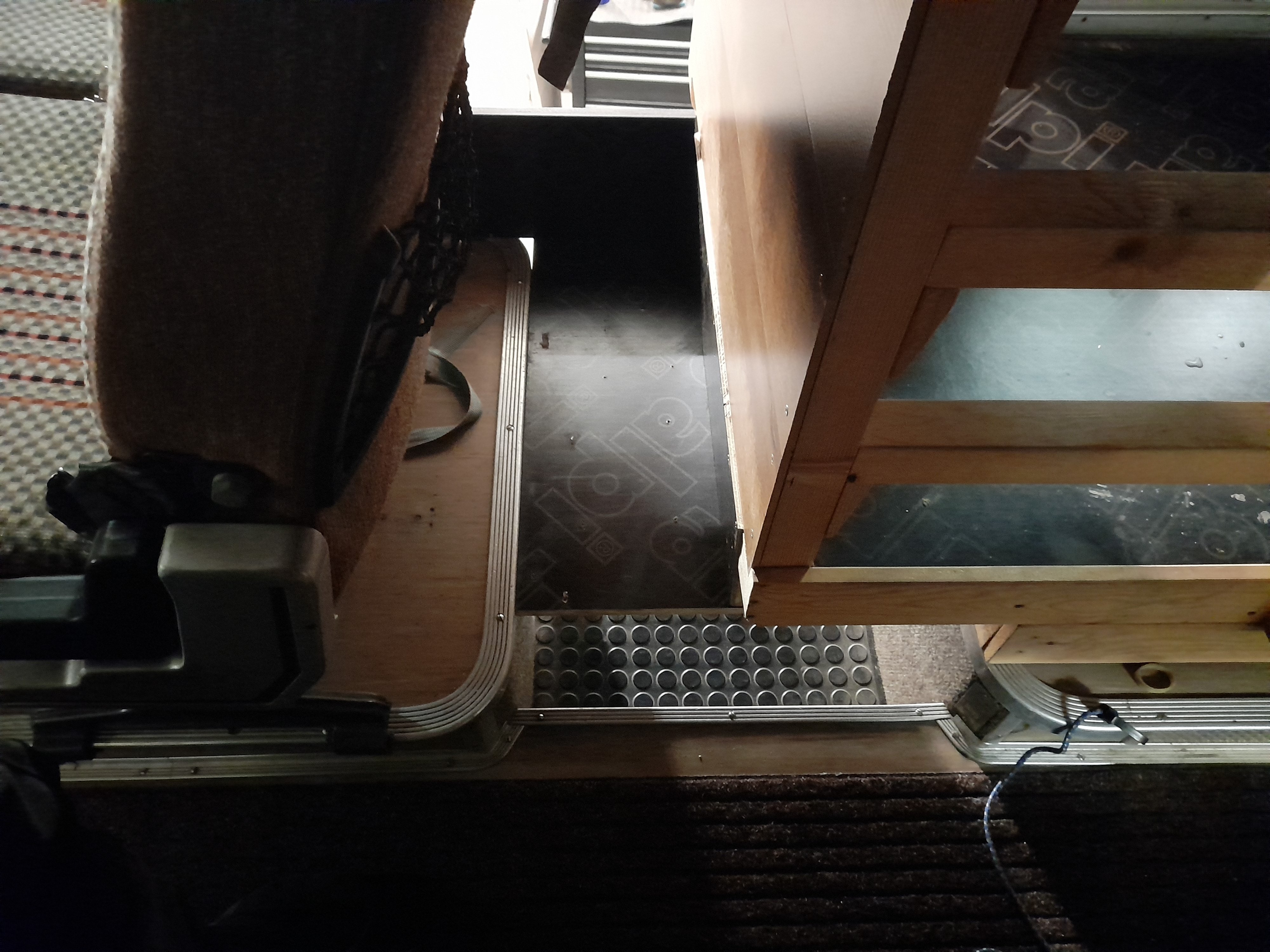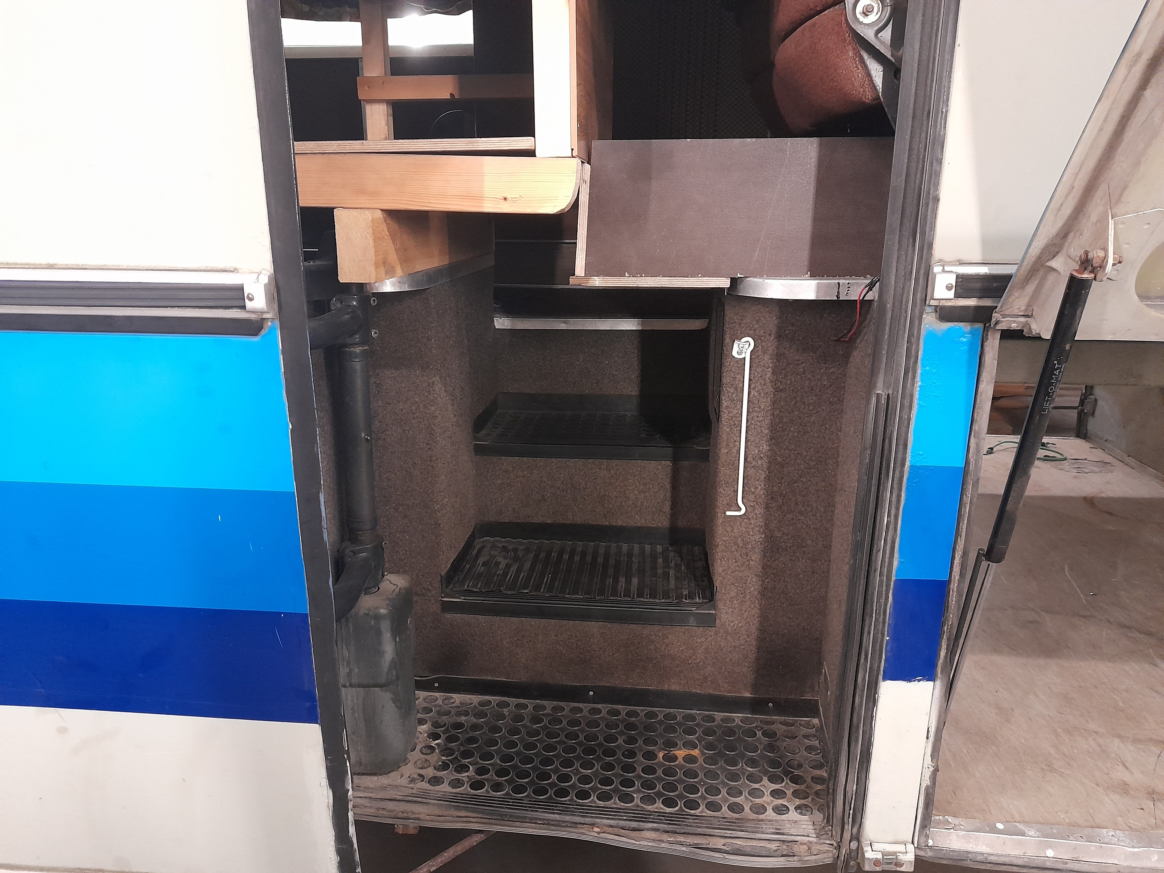 Takaovi ei ole meidän aikana toiminut kunnolla. Eikä sitä olla mihinkään tarvittukaan. Nyt askartelin pienen tason siihen. Saa pari laatikkoa tavaraa näppärästi. Oviventtiili on suhissut ja hukannut paineita. On ollut tulpattuna. Nyt käytin venttiilin auki ja uusin mäntiin tiivisteet. Nyt menee hienosti kiinni, muttei aukea auki asti. Avautuu lukosta ja saa käsin auki. Joku jumi on vielä jossain. Pitää selvitellä. Pääasia että pysyy kiinni ja pitää paineet.