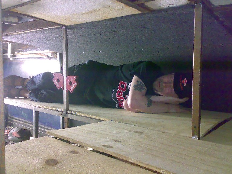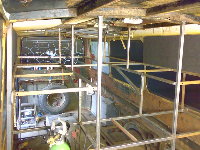 Kattoa ei keritty tekemään mutta, seinälevyjä verhoiltu ja asennettu, takaosan sängyt hitsattu kasaan. On meinaan sellanen putkiviidakko et huh, mutta saatiin kuitenkin parvi ja 5 makuupaikkaa ja vielä mahtuu auto alapuolelle tai flyykeli.