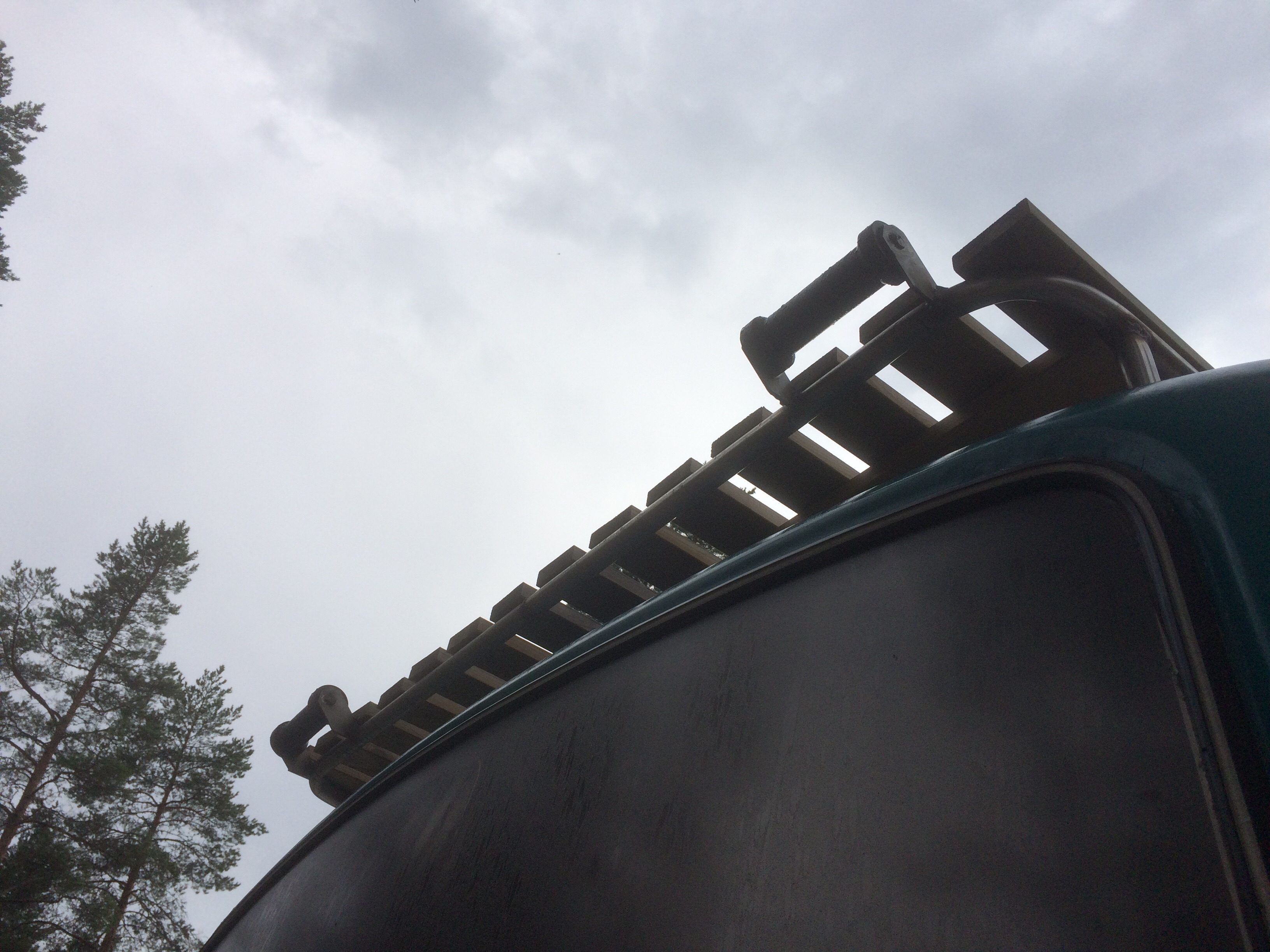 PEM-putki mahtuu kulkemaan pattereiden alla. Matkaa huussilta takatavaratilaan tulee noin 3,5m. Pytyn päässä linjaan tulee 1"-kumiletku rosteri klemmareilla ja säiliön päähän messinkinen 90-kulma. Säliöön linja kiinnittyy kynsiliittimien avulla. Väliin pikku pätkä kumiletkua, jotta kynnet saa auki ja kiinni. Säiliön ilmausputkeen kokeilen kaasunaamarin patruunaa, jos se ei vie hajuja niin vedän tuuletusputken katolle.