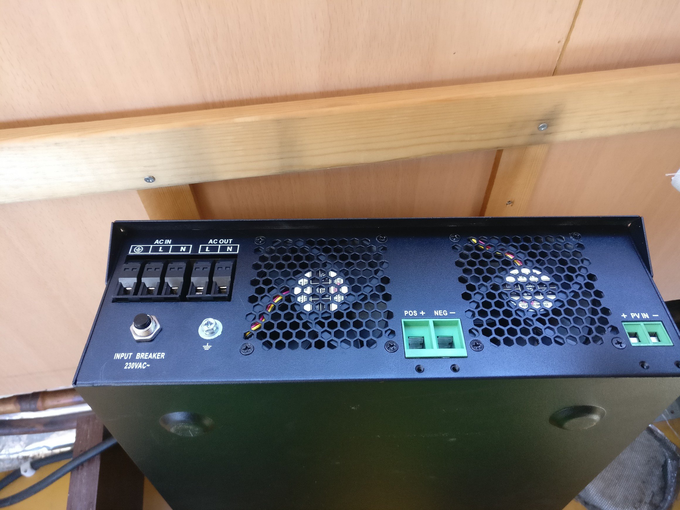 keskukseen menevä pätkä kytketään invertterin lähtöpuolelle ja pistokkeelta tuleva tulopuolelle.