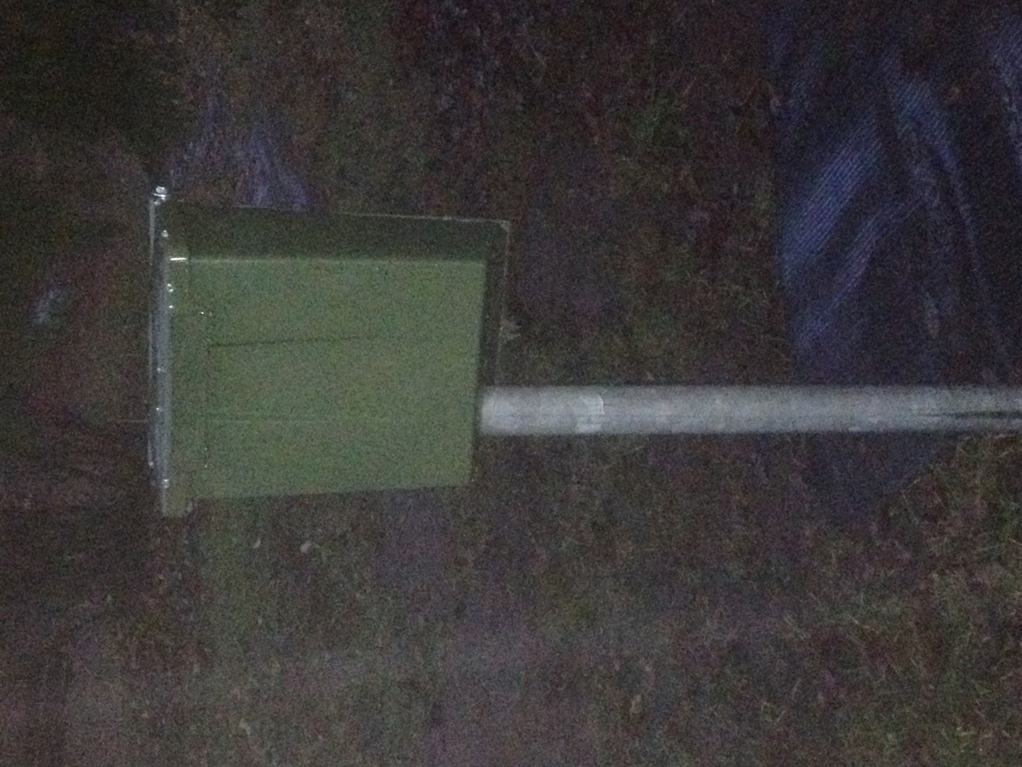 Tolpannokassa on voimavirta- ja Schukoreijjät ja koko keksinnön peittää postilaatikko. Olen siitä erityisen ylpeä! Takaseinään on sisäpuolelle kiinnitetty seinänkokonen 12mm filmivaneeri. Siitä koko keksintö on tolpassa kii ja siihen on myös pistorasia kiinnitetty. Se takaseinä on sahattu nurkkia myöten irti (samoin ku pohja). Kansi on ruuvvattu kii muuhun laatikkoon, saranat on samat. Nyt ku ottaa kannesta kii, ni aukee koko laatikko (vähän niinku kiihytysladassa flippikeula) ja on tilaa kikkailla johtojen kanssa. Sit ku johdot on kii, lasketaan laatikko kii ja rasiat pysyy räntäsuojassa.
