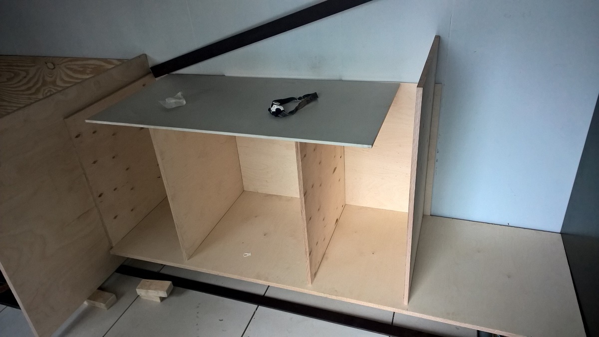 Sieltäpä sekin pikkuhiljaa alkaa muotoutumaan... Enhän mä ny tietenkään totakaan kokonaisena sinne saa yksin roudattua vaan se on pistettävä palasiks ja kasattava paikoilleen "kohteessa" :) (Ja muutenkin jätin ton ny totaalisen vaiheeseen ku en oo viel varma mimmosen jääkaapin laitan sinne... (miel tekis semmosta waecon jääkaappi pakastin hässäkkää...mut on pirulainen kallis. :) ) Mut eiköhän sekin selviä sitte aikanaan kun noita alan lopullisesti sinne kasaileen. :)