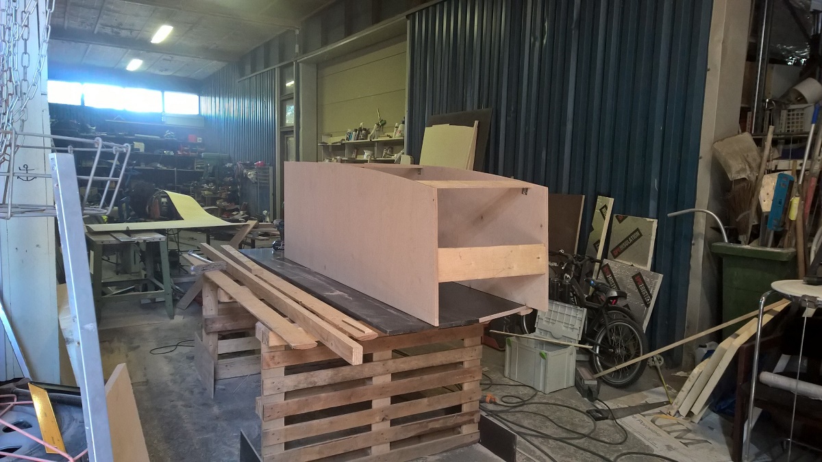 "Keittiöelementin" valmistelua hallin pöydällä...
