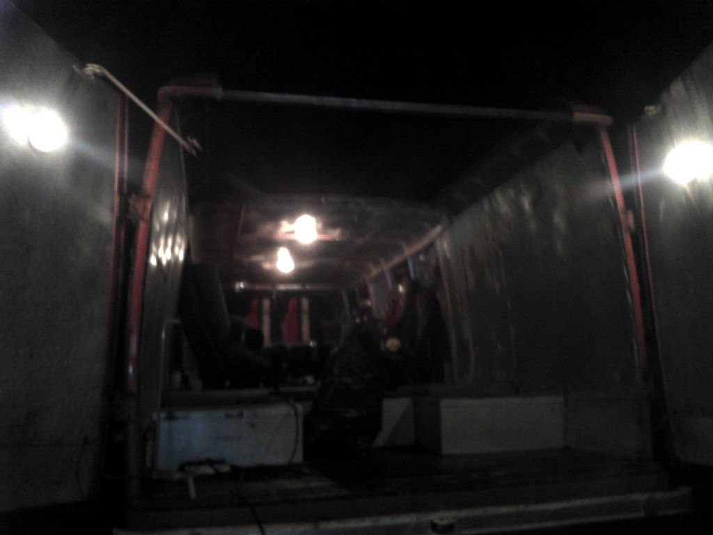 Meinaspa käyvä vanhanaikaisesti, paloautohan ei voi palaa, vai voiko? Tuollanen ilutulituksen näkönen kuva tuli ku repäsin seinävanerin irti, oli se kyteny jo vajaan tunnin. 50W led-valon keilassa näky ihmeellistä utua, ja savuahan se piru oli!