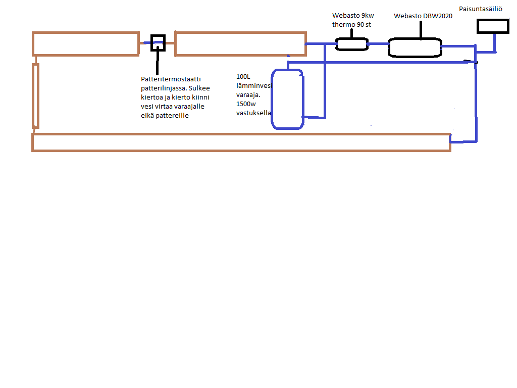 Vai pitäskö tossa linjassa ennen pattereita ja varaajan kohalla olla ennemmin joku venttiili millä sais säädettyä pattereille vettä ja varaajalle mikä sitten jotenkin kääntyilis tarpeen mukaan ja kun lämpöä ei tarvita se ohjais ne varaajan...taas kun tarvis se ohjais pattereille lämpimän. Kiertosuuntaa en tohon tajunnut piirtää mutta se on lämmittimiltä vasemmalle.