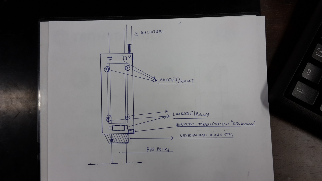 ja rhs palkkien ympärille teen "kelkan"(n.600mm korkea) joka on laakeroitu ylhäältä ja alhaalta ja tuosta "halkiosta" menee paksu latta palkin sisään joka on kiinni siinä "kelkassa" ja teen siihen sylinterille kiinnitys paikan .hydraulisylinterit tulee palkkien sisälle ja ne kiinnitetään siihen kelkkaan ja sylinterin toinen pää laitetaan rhs palkin yläpäähän kiinni. siis sylinteri tulee ylösalaisin...