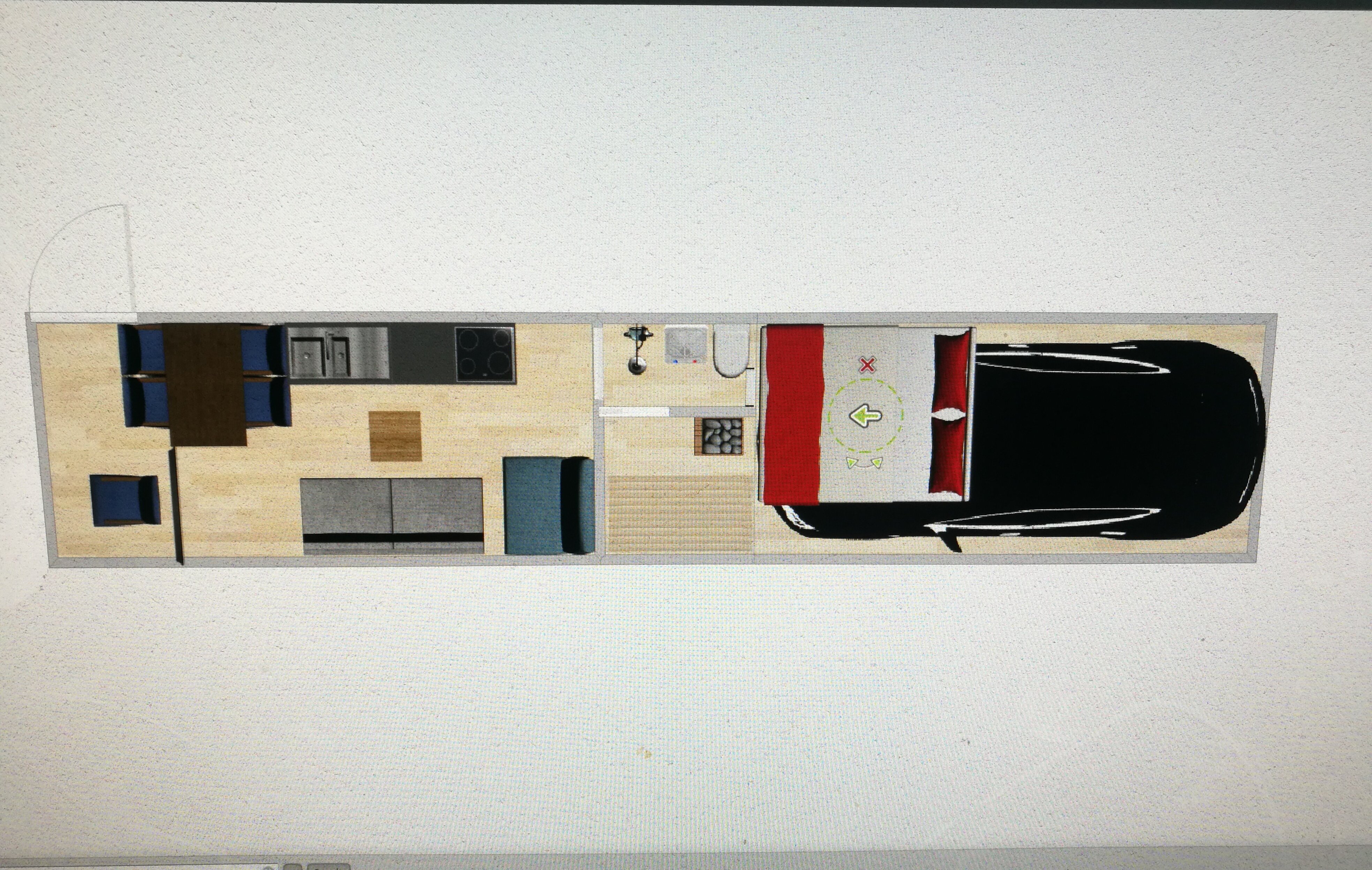 Korkeaan autoon saa jotain järkevää autotallin päälle. Toisaalta sen saunan vois laittaa sinne autotalliin. Keulan kohdalle taitettavat lauteet ja kiuas nurkkaan. Sisäänkäynti verholla tallin puolelle ja ovella asuintiloihin. Parisänky Murphy bed -tyylisesti peräseinään - kulku saunaan toiseen reunaa toiselle puolelle kaappi. Murphyn taakse pöytä mukitelineillä Sittistä varten.