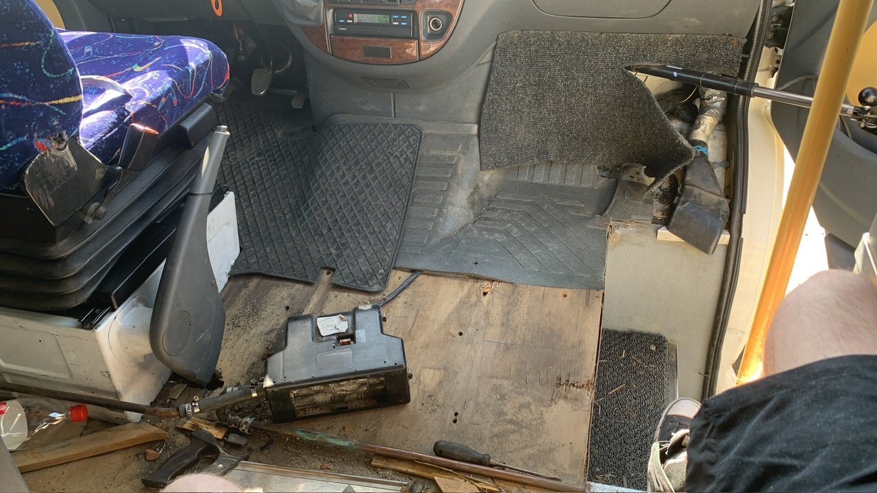 Vielä pitäis löytää apukädet auton alle et sais penkin pultit kii, irrotella toi keltanen kaide myös yläpäästä ja putkit- / letkuttaa kennopuhallin uusiks. Mattoa kans vähä lattialle ja joku systeemi penkin taakse kun sinne jäi nyt pahhuus asumaan ku se feikkilattia on pois. Semmonen kynnys.