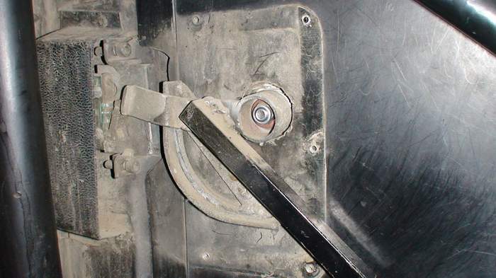 Yritin Setrassa löytää ratkaisua vippiovimekanismiin, että olisin voinut käsin kammeta oven yläasentoon ja lukita sen ylös. Mekanismissa on pysty paineilmasylinteri, joka ensin pyöräyttää oven kiinnni ja nostaa sen ylös. Tuo pyöräytys sylinterillä toimii samalla periaatteella kuin vanhan ajan pumppumeisseli. Enpä saanut käsin liikkumaan ylös. Ratkaisu on pieni erillinen kompura, jolla ovi toimii mukavavasti parkissakin.