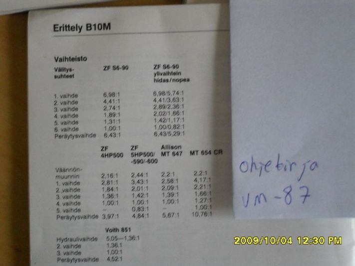 Mistäköhän löytyisi ZF5HP500 laatikon välityssuhteet kaikille vaihteille? Voisin yrittää arvioida millainen välitys tulisi nykyisellä maantieperällä nelosvaihde silmässä. Vertaisin toimintatapaa henkilöautooni Chevrolet Trans Sportiin jossa suurin vaihde on niin iso, että sillä se jaksaa melkein tyhjäkäynnillä pitää matkanopeutta yllä mutta heti kun tarvii nostaa äkkiä nopeutta se pudottaa pienemmän silmään. Tämä voisi olla linjurissa hyväkin asia, tasainen matkavauhti olisi matalilla kierroksilla > hiljaisempi kyyti.   Periaatteessa laskentakaavan mukaan 1600x0,8 saadaan 80kmh kohdalle n.1300 r/min 20% ylivaihteella.