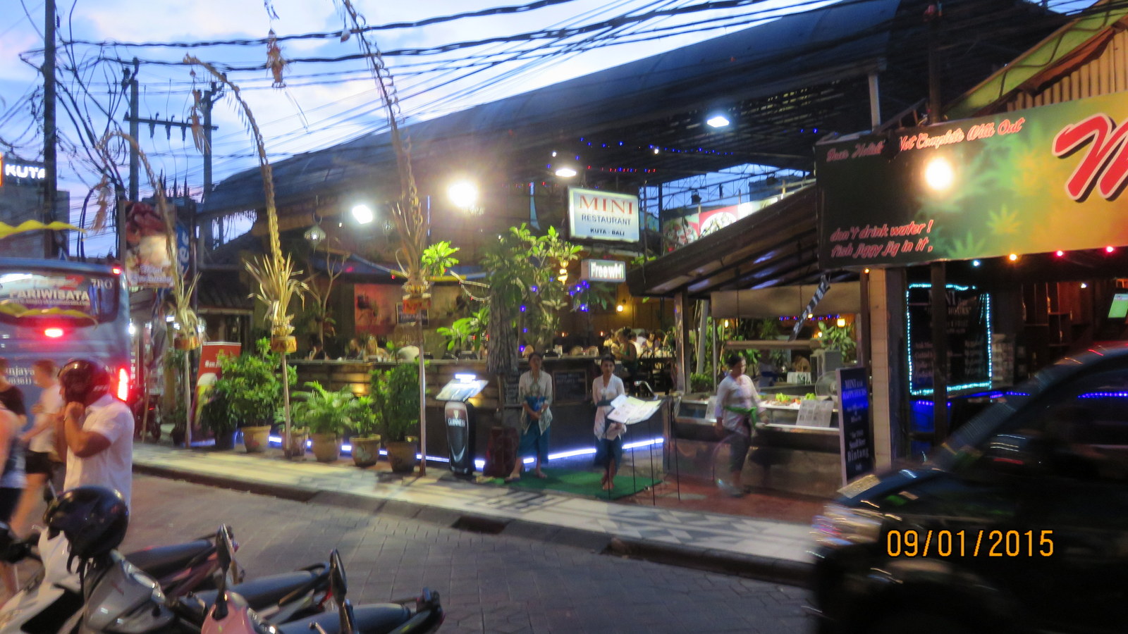 Toissa päivänä kävimme naapuri kylässä Warung Dolphin ravitolassa syömässä, Mr Dolphin haki meidät autollaan ja palautti meidät illan päätteeksi takaisin meidän hotellille. Mr Dolphin ajoi meidät myös Kutasta -->> Lovinaan.