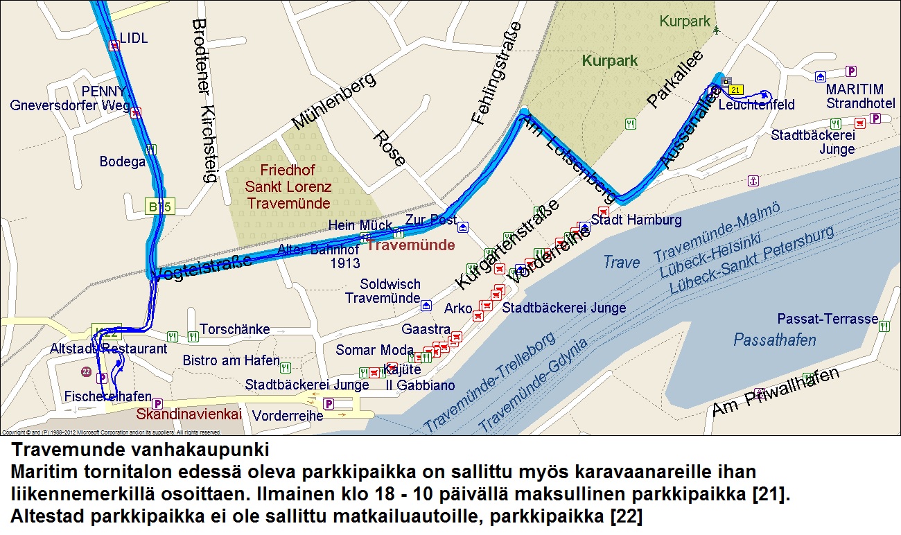 Olimme edellisen yön Travemünden vanhassa kaupungissa kurssikekuksen Karavan/linja-auto parkissa yötä. Marttilan laiva lipui hiljaa meidän pontoonilla olevan ravintolan ohi tasan klo 21:11. Parkkipaikka oli ilmainen klo 18 - 10 välisennä aikana. Klo 10 siiryimme toiseen päähän vanhaa kaupunkia ilmaiseen linja-autoparkkiin.