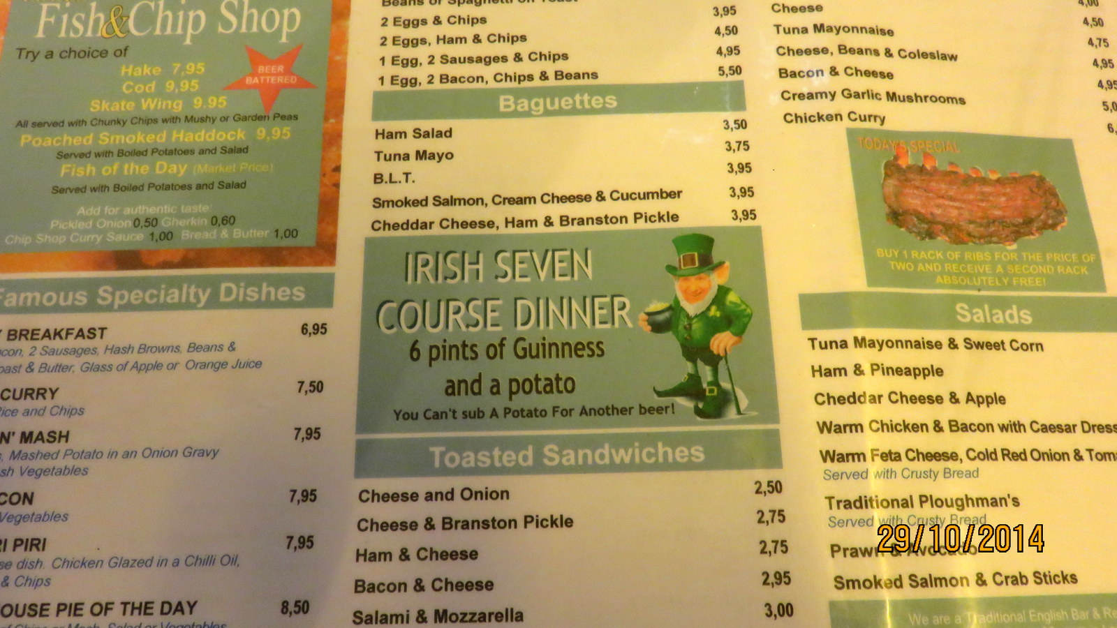 Niin todellä näin on, vanhassa kaupungissa sellainen löytyy. "FOOLS HORSES" niminen Ruokalistalta ehkä jokunen Kylähullu Kulkuri jaksaisi syödä seitsemän kattauksen illallisen. Me otimme vain parit pienet oluet ja lähdimme syömään intialaiseen josta kotimatkalla oikaisimme "NEXT DOOR" kautta iltamyssylle.