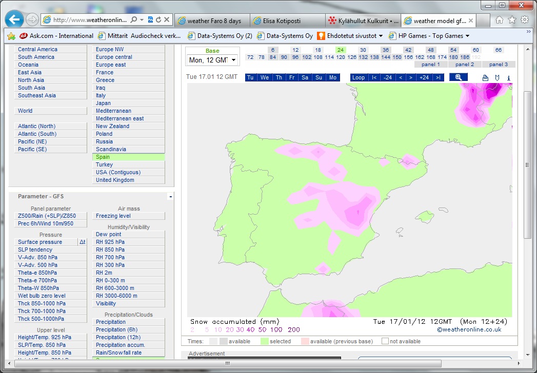 No niinpä näkyy olevan Barcelonasta ihan Afrikkaan asti, tuossa weatheronline kuvassa olen valinnut ennustettu summautunut lumitilanne Ti 17.1.2012 klo 12 GMT tilanne, laitan myös sivun linkin jos joku haluaa seurata lumitilannetta.
